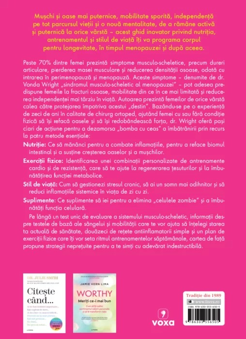 Peste 70% dintre femei prezintă simptome musculo-scheletice, precum dureri articulare, pierderea masei musculare și reducerea densității osoase, odată cu intrarea în perimenopauză și menopauză. Aceste simptome – denumite de dr. Vonda Wright „sindromul musculo-scheletic al menopauzei” – pot adesea predispune femeile la fracturi osoase, mobilitate din ce în ce mai limitată și reducerea independenței mai târziu în viață. Autoarea prezintă femeilor de orice vârstă calea către protejarea împotriva acestui „destin”. Bazându-se pe o experiență de zeci de ani în calitate de chirurg ortoped, ajutând femei cu sau fără condiție fizică să își refacă oasele și să își redobândească forța, dr. Wright oferă pași clari de acțiune pentru a dezamorsa „bomba cu ceas” a îmbătrânirii prin recurs la patru metode esențiale: