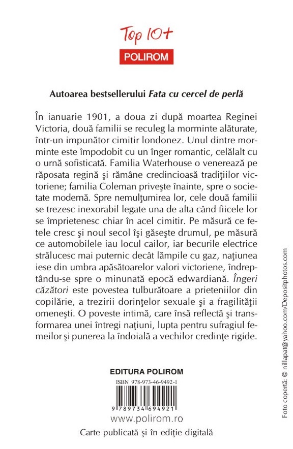 În ianuarie 1901, a doua zi după moartea Reginei Victoria, două familii se reculeg la morminte alăturate, într-un impunător cimitir londonez. Unul dintre morminte este împodobit cu un înger romantic, celălalt cu o urnă sofisticată. Familia Waterhouse o venerează pe răposata regină şi rămâne credincioasă tradiţiilor victoriene; familia Coleman priveşte înainte, spre o societate modernă. Spre nemulţumirea lor, cele două familii se trezesc inexorabil legate una de alta când fiicele lor se împrietenesc chiar în acel cimitir. Pe măsură ce fetele cresc şi noul secol îşi găseşte drumul, pe măsură ce automobilele iau locul cailor, iar becurile electrice strălucesc mai puternic decât lămpile cu gaz, naţiunea iese din umbra apăsătoarelor valori victoriene, îndreptându-se spre o minunată epocă edwardiană. Îngeri căzători este povestea tulburătoare a prieteniilor din copilărie, a trezirii dorinţelor sexuale şi a fragilităţii omeneşti. O poveste intimă, care însă reflectă şi transformarea unei întregi naţiuni, lupta pentru sufragiul femeilor şi punerea la îndoială a vechilor credinţe rigide.