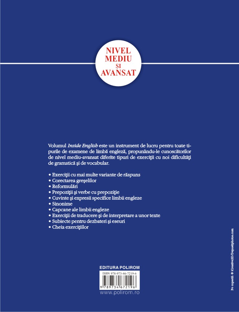 Volumul Inside English este un instrument de lucru pentru toate tipurile de examene de limbă engleză, propunîndu-le cunoscătorilor de nivel mediu-avansat diferite tipuri de exerciţii cu noi dificultăţi de gramatică şi de vocabular.