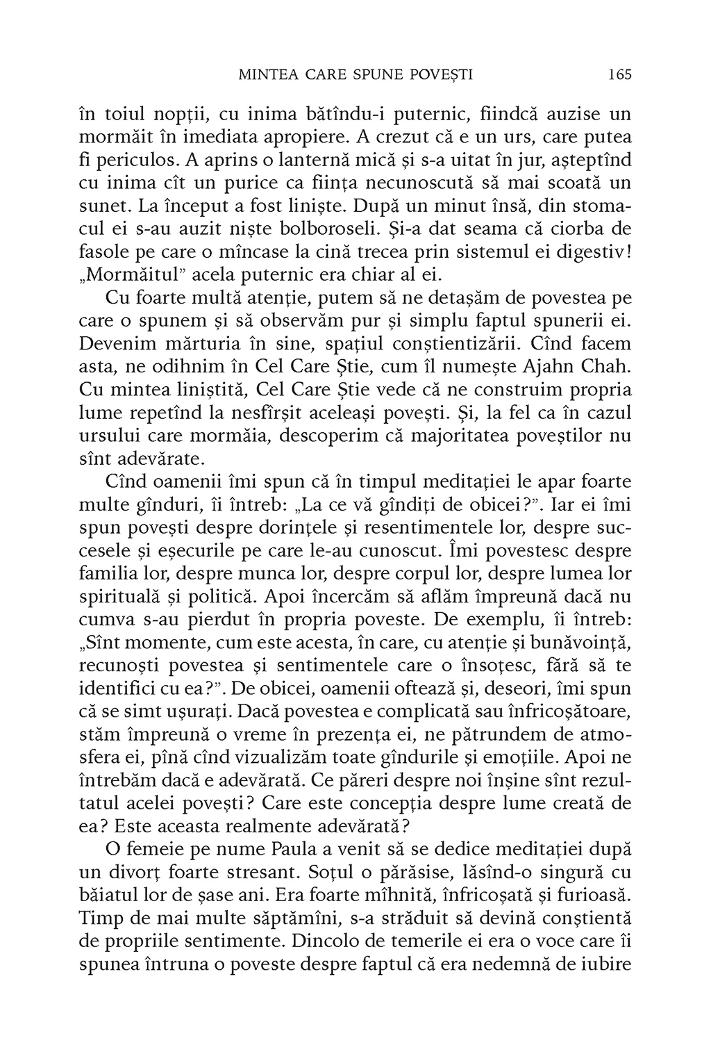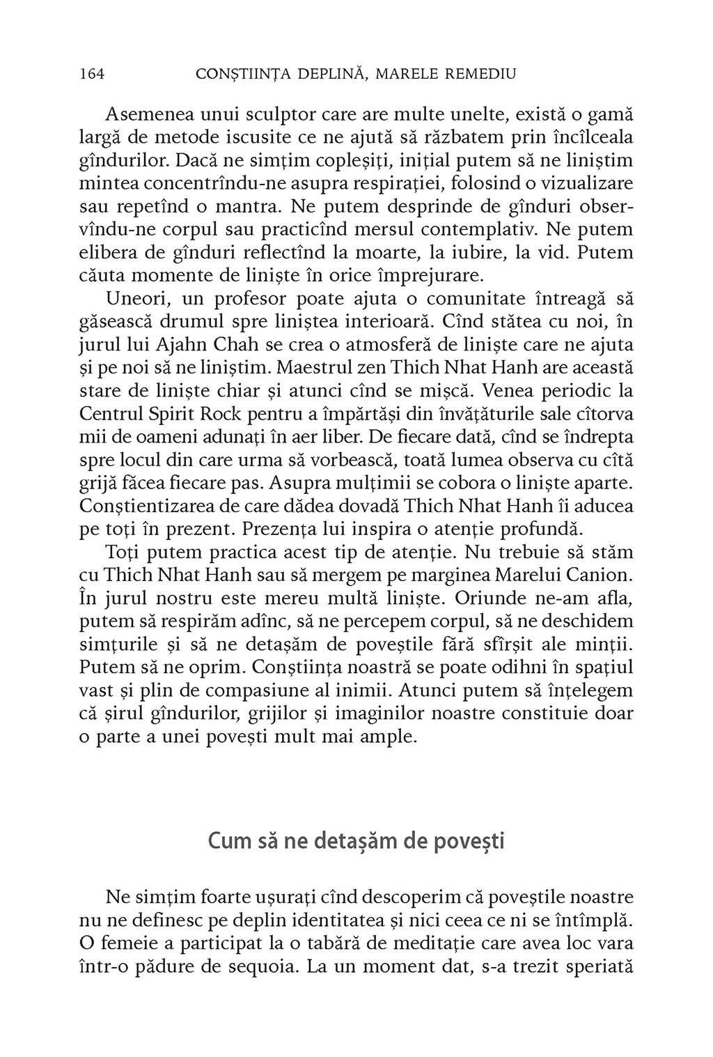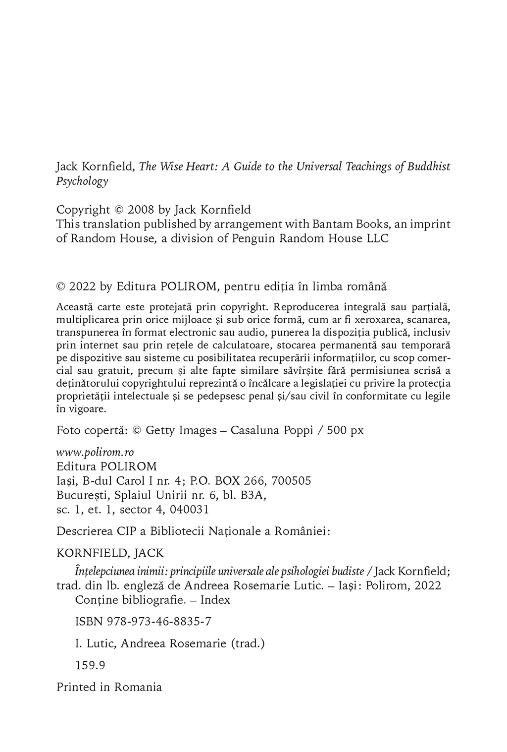 Avem în noi capacităţi nelimitate de iubire profundă, de bucurie, de comuniune cu viaţa şi de libertate, afirmă Jack Kornfield, oferindu-ne cel mai accesibil, mai cuprinzător şi mai edificator ghid de psihologie budistă publicat vreodată în Occident. Autorul, ale cărui cărţi s-au vândut în peste un milion de exemplare în întreaga lume, face o prezentare detaliată a conceptului budist de „mindfulness” şi a modului în care poate fi folosit acesta în procesul transformării personale, incluzând exerciţii specifice, precum şi poveştile impresionante ale oamenilor pe care i-a întâlnit în calitatea sa de instructor şi de psihoterapeut. O carte despre puterea transformatoare a psihologiei budiste, utilă atât celor care practică meditaţia, cât şi profesioniştilor din domeniul sănătăţii mintale.