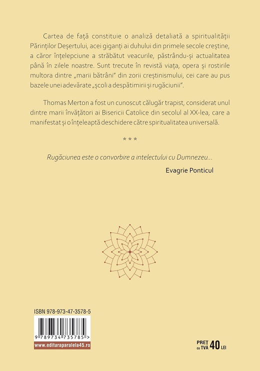 Cartea de față constituie o analiză detaliată a spiritualității Părinților Deșertului, acei giganți ai duhului din primele secole creștine, a căror înțelepciune a străbătut veacurile, păstrându-și actualitatea până în zilele noastre. Sunt trecute în revistă viața, opera și rostirile multora dintre „marii bătrâni“ din zorii creștinismului, cei care au pus bazele unei adevărate „școli a despătimirii și rugăciunii“.