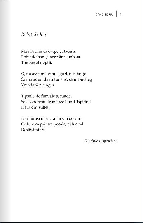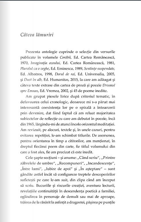 „Prezenta antologie cuprinde o selecţie din versurile publicate în volumele Corăbii, Ed. Cartea Românească, 1970, Imaginaţia ecoului, Ed. Cartea Românească, 1981, Pluralul ca o veghe, Ed. Eminescu, 1989, Sentinţe suspendate, Ed. Albatros, 1998, Dorul de rai, Ed. Universalia, 2005, şi Duet în alb, Ed. Humanitas, 2015, la care am adăugat şi câteva texte extrase din cartea de proză şi poezie Drumul spre Emaus, Ed. Vremea, 2002, şi din 45 de poeme inedite.“ – MONICA PILLAT