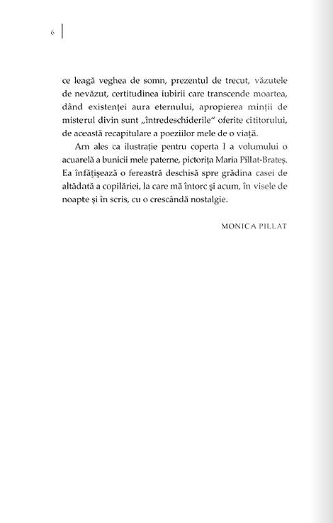 „Cele şapte secţiuni şi anume: «Când scriu», «Printre zăbrelele de umbre», «Recompuneri», «Incandescenţe», «Între lumi», «Iubire de apoi» şi «În aşteptare» – sunt gândite astfel încât să configureze treptele descoperirilor sufleteşti pe care le-am suit, din clipa când am început să scriu. Bucuriile şi riscurile creaţiei, aventura lecturii, revelaţiile continuităţii în descendenţa poetică a familiei, oglindirea în personaje de demult sau mai de aproape, trăirea de la răsărit la asfinţit a dragostei, păşirea pe punţile ce leagă veghea de somn, prezentul de trecut, văzutele de nevăzut, certitudinea iubirii care transcende moartea, dând existenţei aura eternului, apropierea minţii de misterul divin sunt «întredeschiderile» oferite cititorului de această recapitulare a poeziilor mele de o viaţă.“ – Monica Pillat