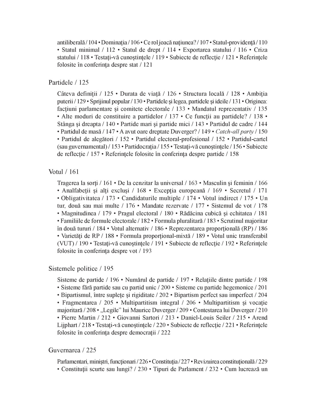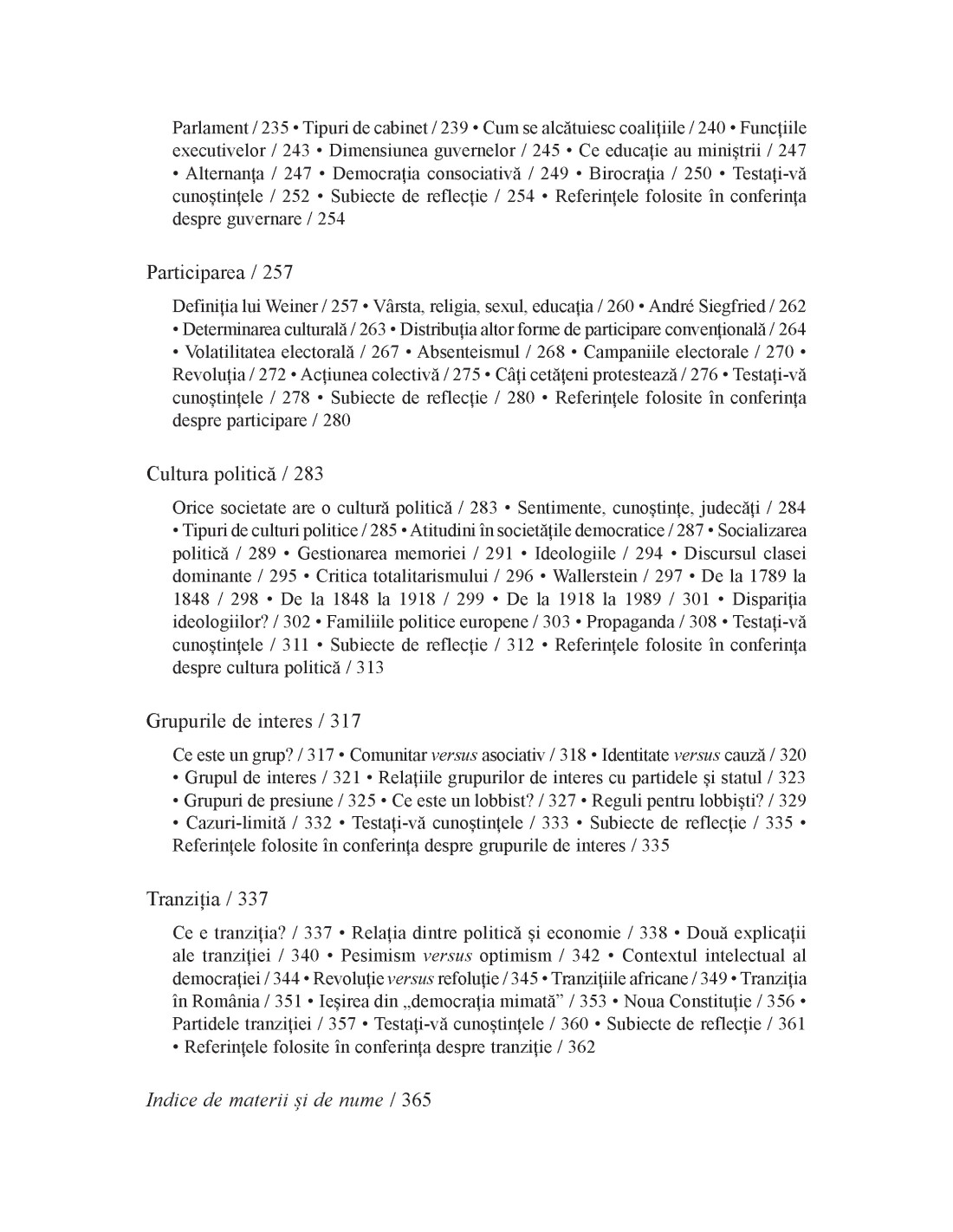Cele mai importante instrumente analitice necesare pentru a explica funcționarea regimurilor politice, precum și principalele teme ce permit o mai bună înțelegere a societăților contemporane sunt discutate pe baza referirilor la textele fundamentale ale științei politice. Construit în jurul unor concepte-cheie des uzitate, dar ale căror înțelesuri rămân insuficient cunoscute publicului larg, volumul e un excelent instrument de lucru atât pentru studenții în științe politice, cât și pentru jurnaliști și toți cei interesați de viața politică în general.