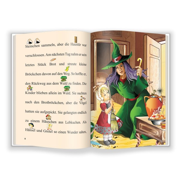 Cartea prezintă basmul despre frații Hänsel și Gretel și despre vrăjitoarea care locuia într-o căsuță de turtă dulce, într-un format special pentru copiii care vor să învețe să citească în limba germană.