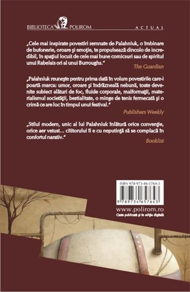 „Palahniuk reuneste pentru prima data in volum povestirile care-i poarta marca: umor, oroare si indrazneala nebuna, toate devenite subiect alaturi de foc, fluide corporale, malformatii, materialismul societatii, bestialitate, o minge de tenis fermecata si o crima ce are loc in timpul unui festival.” (Publishers Weekly)