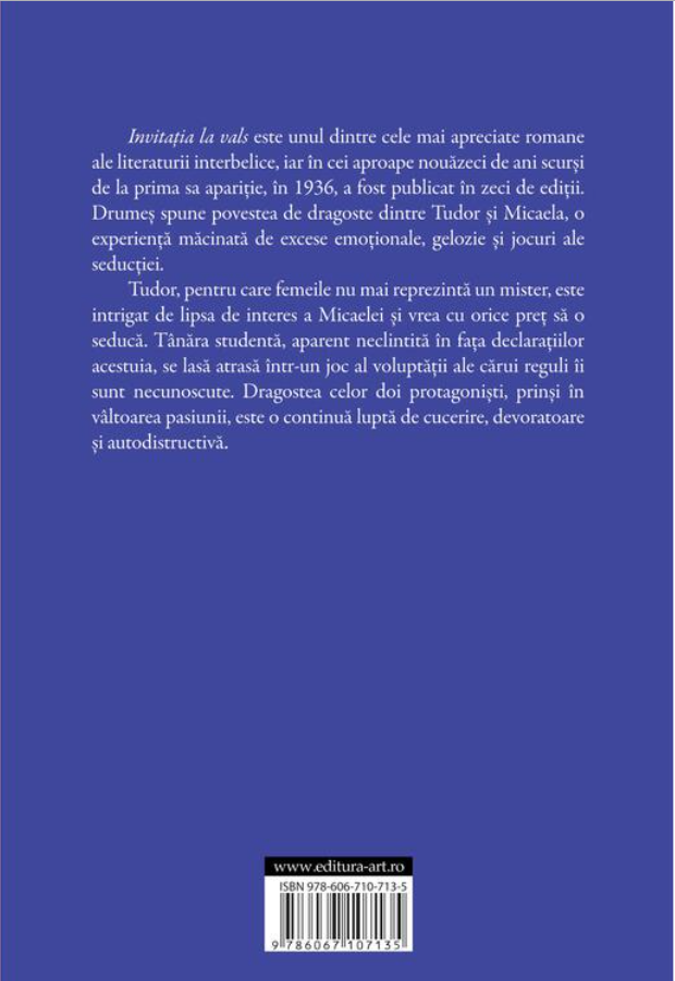 Invitația la vals este unul dintre cele mai apreciate romane ale literaturii interbelice, iar în cei aproape nouăzeci de ani scurși de la prima sa apariție, în 1936, a fost publicat în zeci de ediții. Drumeș spune povestea de dragoste dintre Tudor și Micaela, o experiență măcinată de excese emoționale, gelozie și jocuri ale seducției. O poveste de dragoste sau o poveste despre răzbunare? Și una, și alta, Invitația la vals dă ritmul unui dans amețitor – iar nicidecum un simplu vals –, care-o să te lase fără răsuflare.
