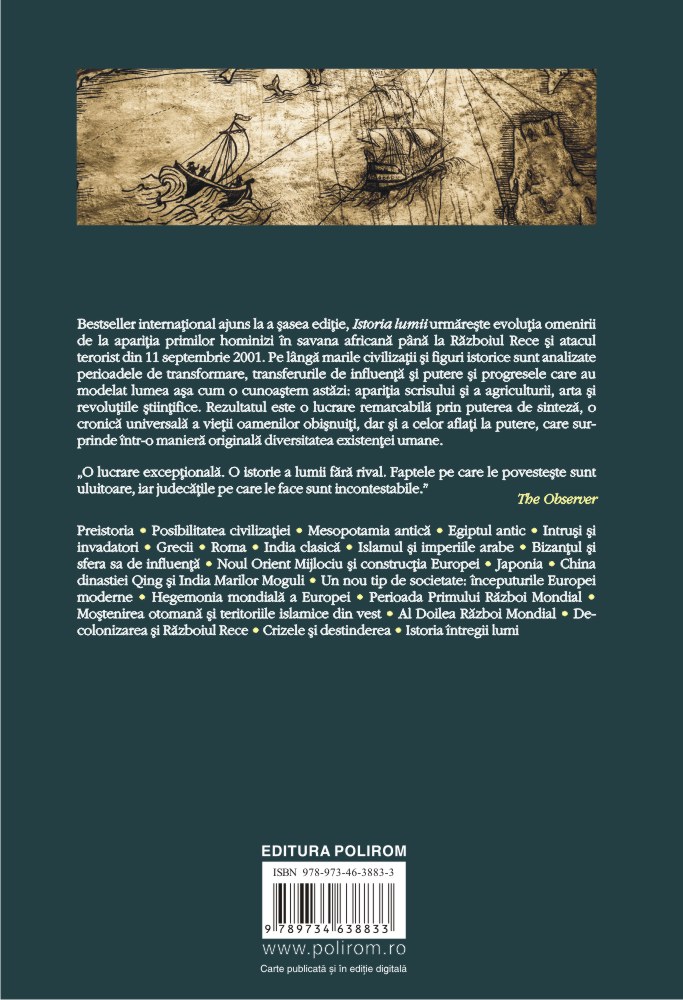 Bestseller internaţional ajuns la a şasea ediţie, Istoria lumii urmăreşte evoluţia omenirii de la apariţia primilor hominizi în savana africană pînă la Războiul Rece şi atacul terorist din 11 septembrie 2001. Pe lîngă marile civilizaţii şi figuri istorice sînt analizate perioadele de transformare, transferurile de influenţă şi putere şi progresele care au modelat lumea aşa cum o cunoaştem astăzi: apariţia scrisului şi a agriculturii, arta şi revoluţiile ştiinţifice. Rezultatul este o lucrare remarcabilă prin puterea de sinteză, o cronică universală a vieţii oamenilor obişnuiţi, dar şi a celor aflaţi la putere, care surprinde într-o manieră originală diversitatea existenţei umane.