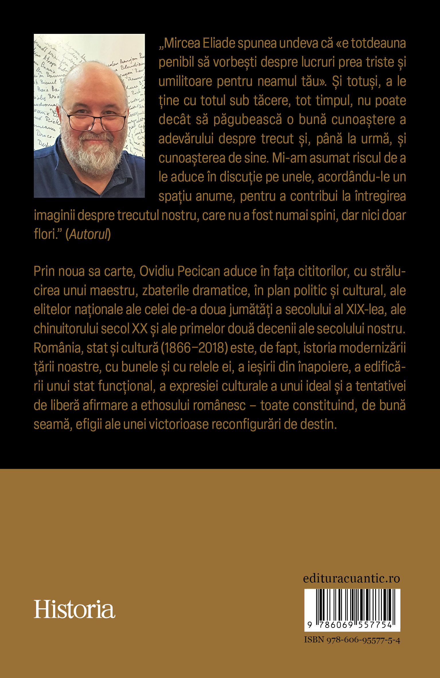Prin noua sa carte, Ovidiu Pecican aduce în fața cititorilor, cu strălucirea unui maestru, zbaterile dramatice, în plan politic și cultural, ale elitelor naționale ale celei de-a doua jumătăți a secolului al XIX-lea, ale chinuitorului secol XX și ale primelor două decenii ale secolului nostru. România, stat și cultură (1866-2018) este, de fapt, istoria modernizării țării noastre, cu bune și cu relele ei, a ieșirii din înapoiere, a edificării unui stat funcțional, a expresiei culturale a unui ideal și a tentativei de liberă afirmare a ethosului românesc – toate constituind, de bună seamă, efigii ale unei victorioase reconfigurări de destin.