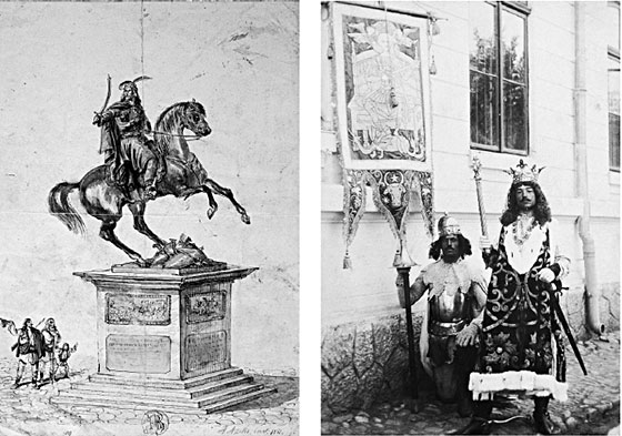 Serbarea comemorativă a 400 de ani de la moartea lui Ștefan cel Mare, 2/15 iulie 1904: ilustrată cu desenul-acuarelă al lui Alexandru Asachi (1861) pentru un proiect de statuie a domnitorului; fotografie cu participanţi la reconstituirea istorică purtând stindardul lui Ștefan cel Mare.