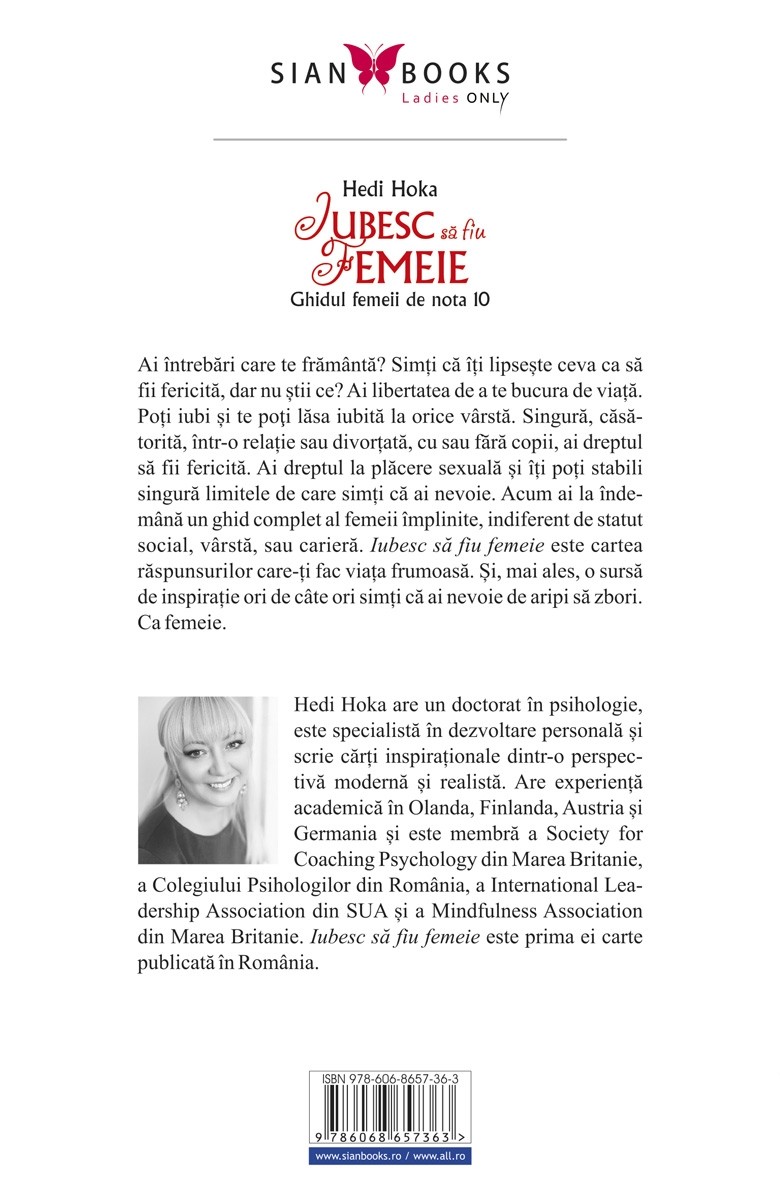 Psihologa Hedi Hoka a întocmit un ghid complet al femeii împlinite, indiferent de vârstă, de situația familială, de carieră sau de valoarea genții pe care o poartă. Cartea cuprinde o serie de sfaturi practice și informații inedite, prezentate cu umor și poftă de viață.
