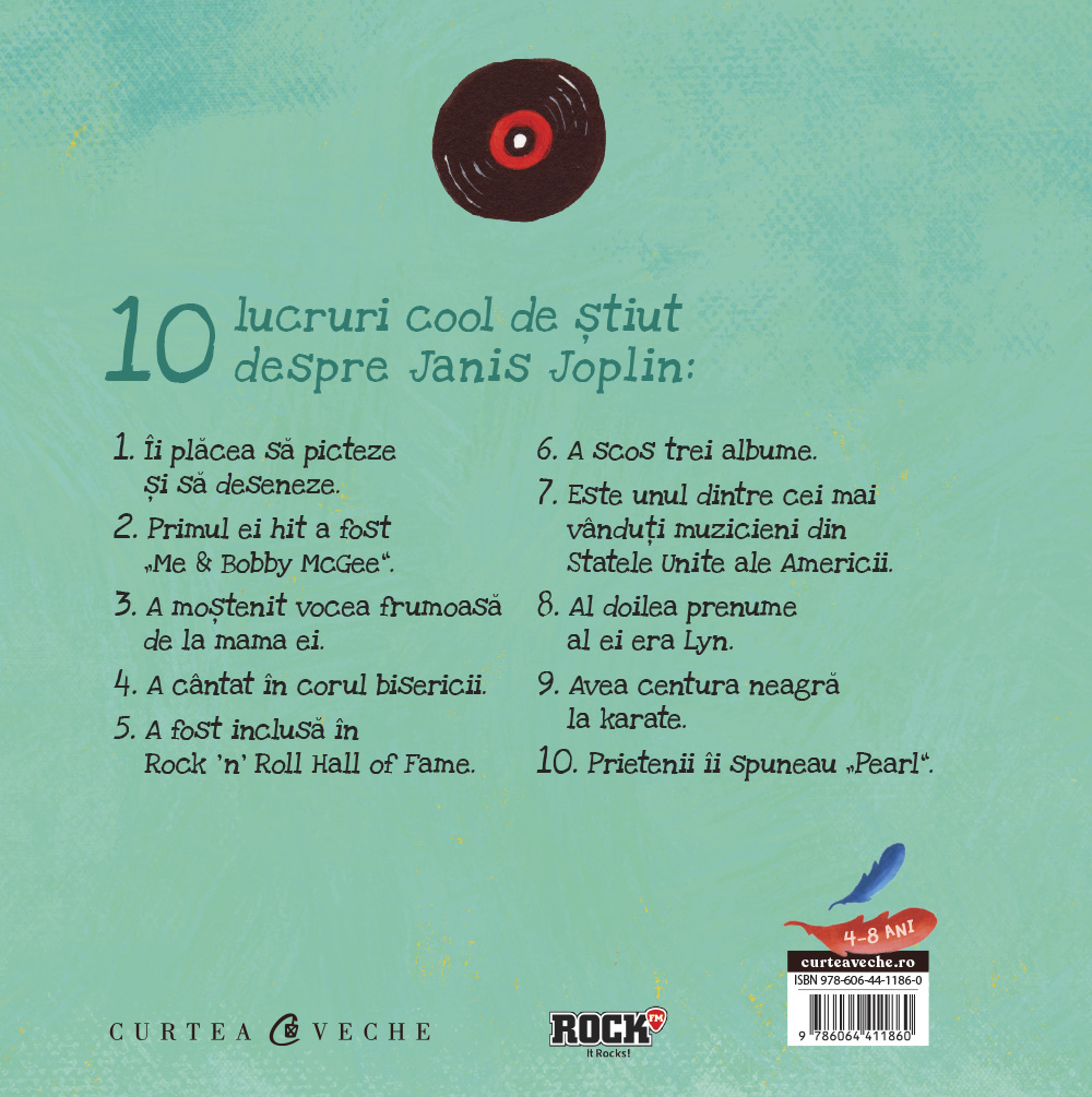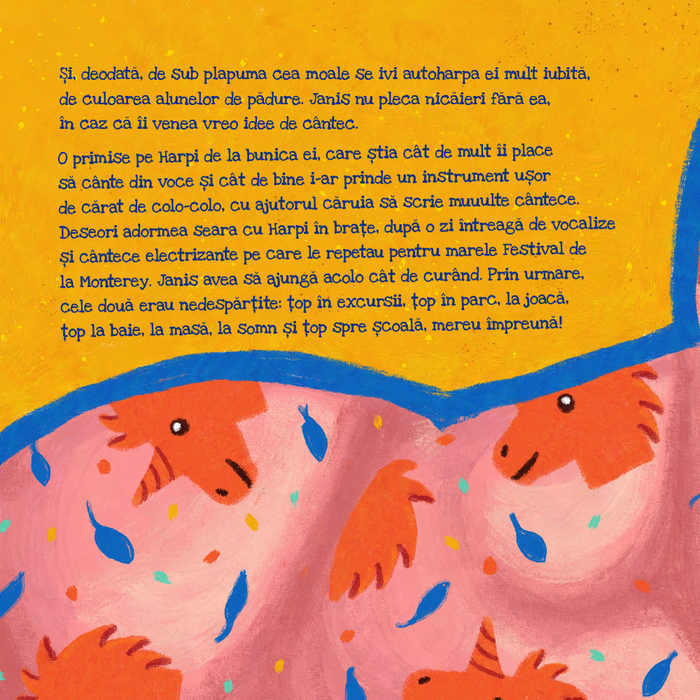 Deschideți prima carte despre Janis Joplin pentru copii și haideți să ne jucăm de-a legendele rock! Ce-ar fi să ne imaginăm cum au fost cei mai cunoscuți muzicieni ai genului când erau copii, cum au pornit pe drumul spre celebritate și cum au ajuns numele lor pe buzele tuturor?! Cărticica despre Janis și autoharpa ei, Harpi, este al doilea volum din seria Tiny Rockers și vă inspiră – mari și mici – să povestiți despre rockul clasic și să vă (re)îndrăgostiți de acordurile și vocile lui celebre.