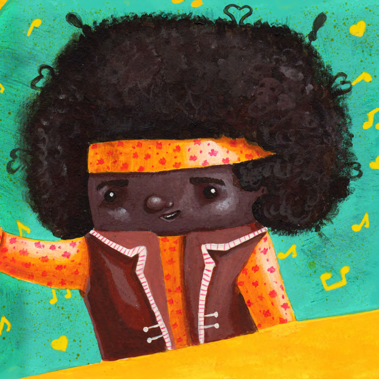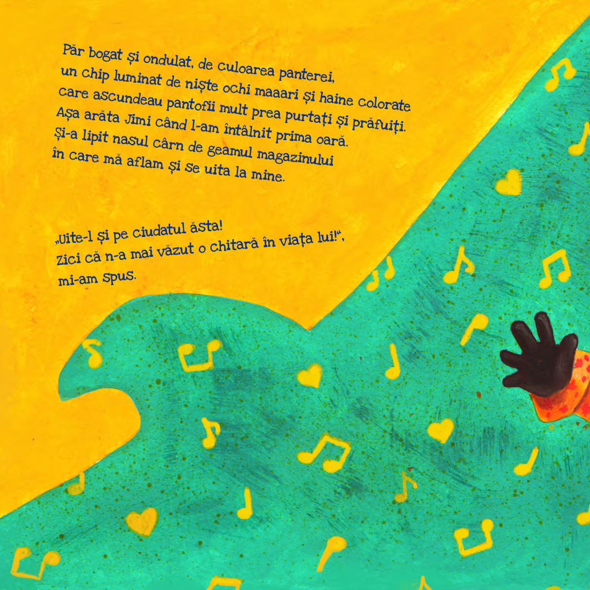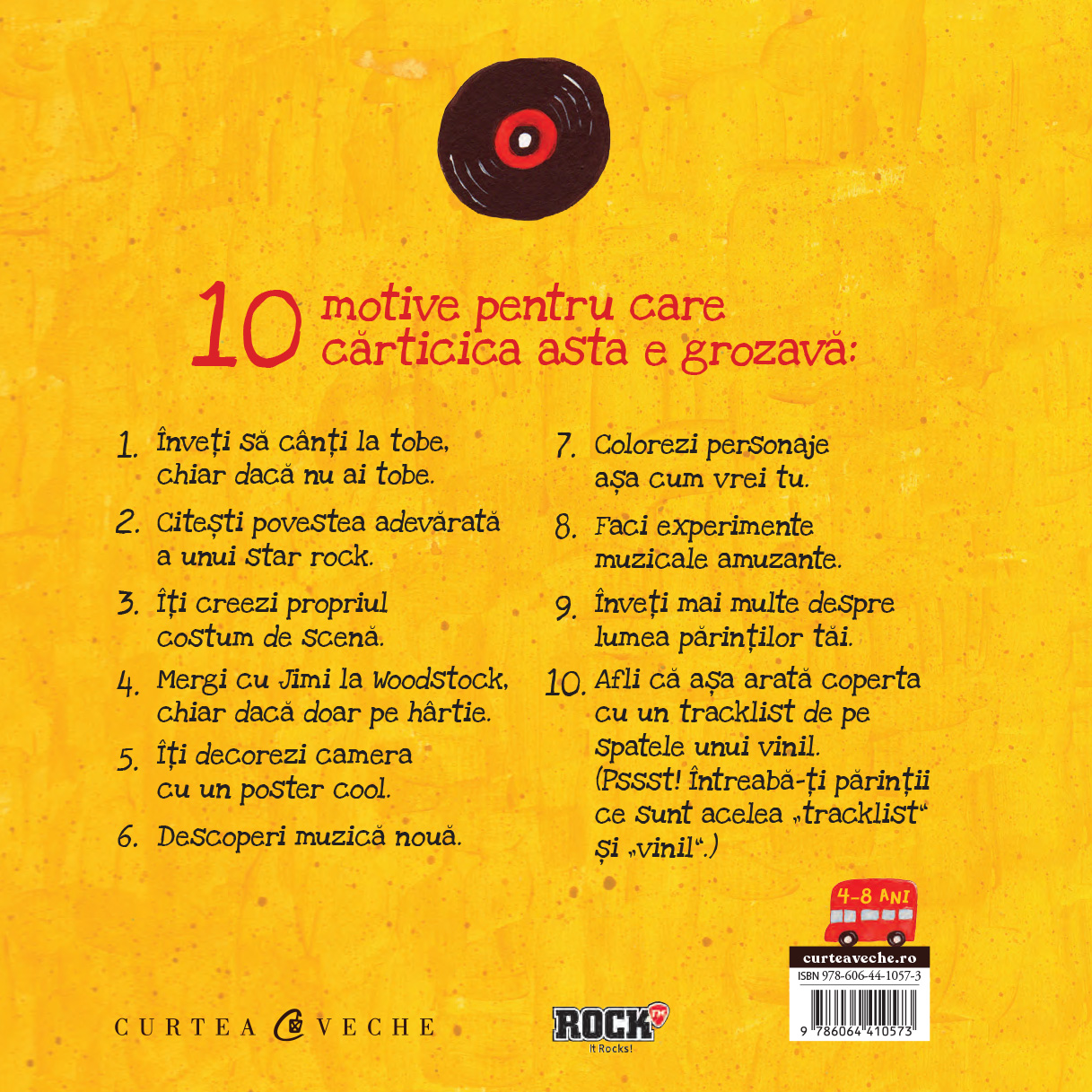 Înainte să fie marele chitarist de care am auzit cu toții, Jimi Hendrix a fost mic. Iar povestea ne spune că, în lipsa unei chitare, cânta la o mătură și, zi de zi, își lipea năsucul cârn de vitrina magazinului de muzică în care strălucea instrumentul pe care și-l dorea atât de mult. Despre cum s-au împrietenit cei doi și cum au ajuns să cânte împreună, despre cum au urcat pe scena de la Woodstock, precum și despre cât de important e să fii perseverent, să faci lucrurile în stilul tău și să îți urmezi visul cu încredere, aflăm din paginile acestei cărți colorate și amuzante, cu o copertă care amintește de plicul unui disc de vinil. Dacă și tu te-ai îndrăgostit de rockul clasic ascultând viniluri pe covorul din sufragerie la pick-up-ul părinților, iar acum ai la rândul tău copii, o să vă placă la nebunie să descoperiți împreună aventurile celor două personaje, un poster cool și o mulțime de activități care îi vor împrieteni pe cei mici cu lumea fascinantă a legendelor muzicii rock.