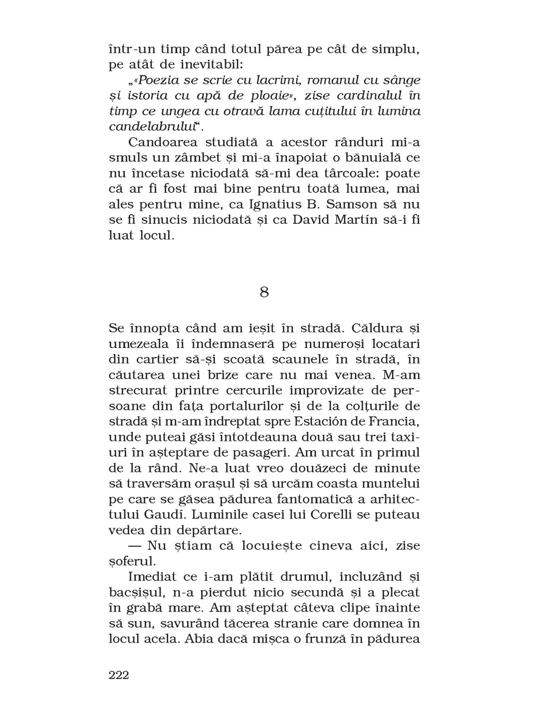 Carlos RUIZ ZAFÓN (1964‑2020) a fost unul dintre cei mai apreciaţi scriitori spanioli ai generaţiei sale. A lucrat în publicitate şi a colaborat la reviste prestigioase, precum La Vanguardia sau El País. Pentru câţiva ani, a locuit la Los Angeles, scriind scenarii de film. Şi‑a început cariera literară în 1993, cu o carte pentru copii, Prinţul din negură (Polirom, 2011, 2015, 2017), pentru care i s‑a decernat Premiul Edebé. I‑au urmat romanele Palatul de la Miazănoapte (1994; Polirom, 2011, 2015, 2017), Luminile din septembrie (1995; Polirom, 2012, 2017), Marina (1999; Polirom, 2010, 2013, 2018), Umbra vântului (2001; Polirom, 2005, 2013, 2023), distins cu Prix du Meilleur Livre Étranger în 2004, şi Jocul îngerului (2008; Polirom, 2009, 2013, 2023). În anul 2011 a apărut Prizonierul cerului (Polirom, 2012, 2013), iar în 2016, Labirintul spiritelor (Polirom, 2018). În 2020 a publicat volumul de povestiri Oraşul de abur (Polirom, 2022), cu care şi‑a luat rămas-bun de la cititorii săi.
