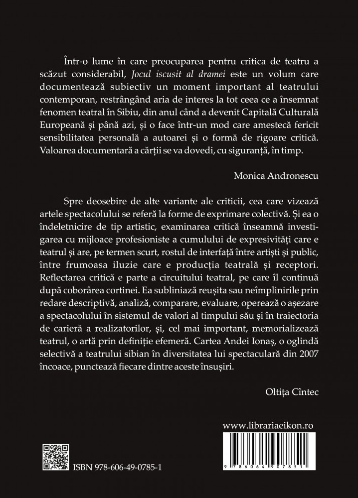 „Jocul iscusit al drameiˮ, expresia prin care Șt. O. Iosif traduce mult mai banalul cuvânt shakespearian „playˮ, din piesa Hamlet, dă numele acestui volum de cronici de teatru care jalonează momente importante ale evoluției artelor spectacolului la Sibiu, începând cu anul 2007, când orașul a fost desemnat Capitală Culturală Europeană alături de Luxemburg. Acum, când Sibiul se pregătește să predea ștafeta Timișoarei, este poate cel mai potrivit moment pentru a reaminti contribuția Teatrul Național „Radu Stanca” și a Festivalului Internațional de Teatru de la Sibiu la obținerea acestui râvnit titlu și la dezvoltarea ulterioară a artei și culturii în România. Sunt 15 ani de întâlniri cu artiști extraordinari ai scenei naționale și internaționale, care au prezentat spectacole la Sibiu sau au colaborat cu teatrul de aici, dezvoltând direcții artistice dintre cele mai variate și mai provocatoare, un deceniu și jumătate în care trupa s-a sudat și maturizat, în care teatrul și-a format și educat publicul. Cartea este structurată în patru părți: Spectacole ale Teatrului Național „Radu Stancaˮ, Spectacole invitate în Festivalul Internațional de Teatru de la Sibiu, Spectacole ale Teatrului pentru Copii și Tineret GONG și Spectacole ale Departamentului de Artă Teatrală din cadrul Universității „Lucian Blagaˮ din Sibiu. Cronicarul realizează astfel o radiografie subiectivă a fenomenului teatral în fosta capitală europeană a culturii, asumând perspectiva unui simplu spectator, care simte că în fragilitatea și efemeritatea fiecărei reprezentații teatrale se află și șansa întâlnirii cu celălalt, a ieșirii din raza propriei individualități și a conlucrării creative dintre artiști și public în vederea constituirii unei lumi imaginare comune. - Anda Ionaș
