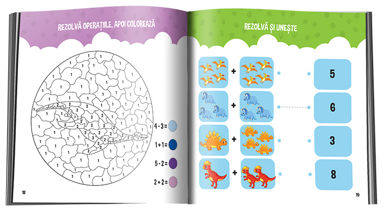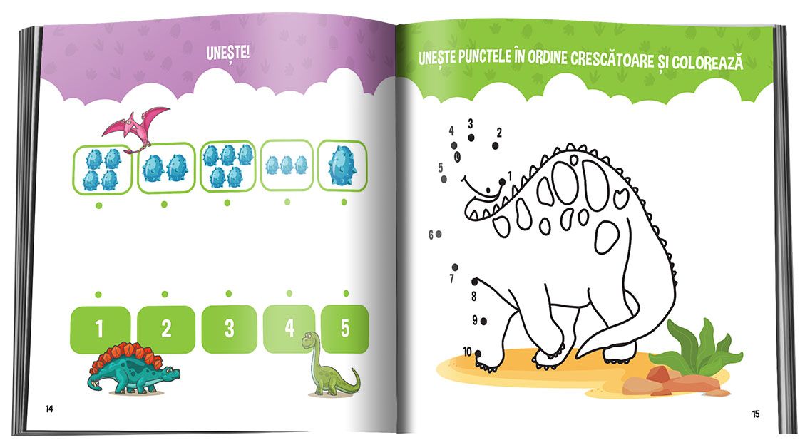 Descoperă cei mai cunoscuți și mai simpatici dinozauri și rezolvă tot felul de activități colorate și amuzante alături de ei!