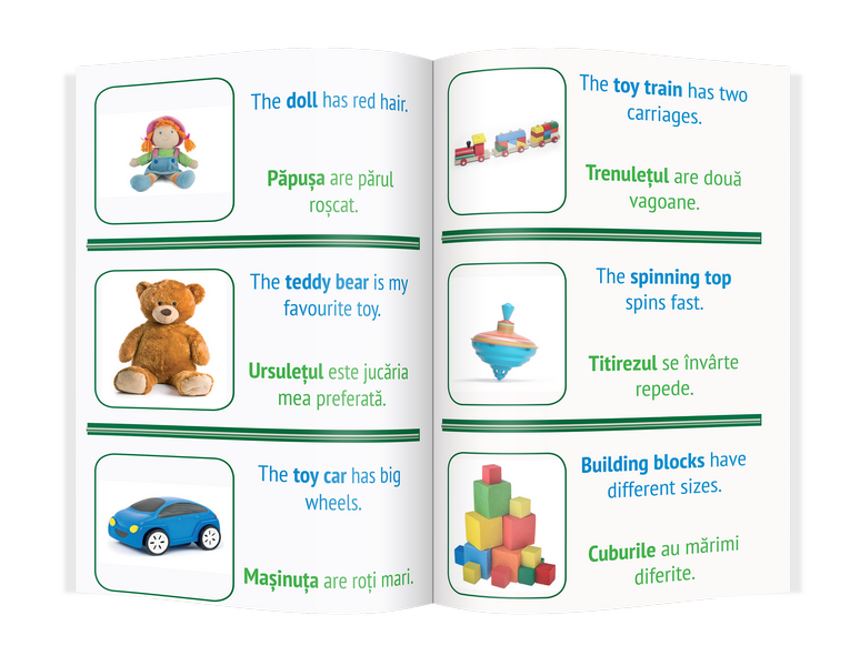 Bingoletto. Jocuri și jucării reprezintă un sistem inedit de a învăța limba engleză, inspirat de popularul joc de bingo. Cu ajutorul acestei metode, copilul va învăța cu ușurință denumirile unor jucării, jocuri și rechizite, îmbogățindu-și astfel vocabularul.