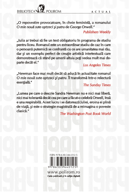 Toată lumea o place pe Julia. Însă, într-o bună zi, se întâlneşte cu Smith şi-i strecoară un bileţel, punând astfel în mişcare evenimentele devastatoare şi de neuitat din povestea orwelliană. Romanul Sandrei Newman ne poartă într-o fascinantă călătorie prin faimoasa distopie a lui Orwell, dezvăluindu-ne, cu originalitate şi inteligenţă artistică, aspecte surprinzătoare ale acelei lumi şi ipostaze la care nici nu ne-am fi gândit ale anumitor personaje.