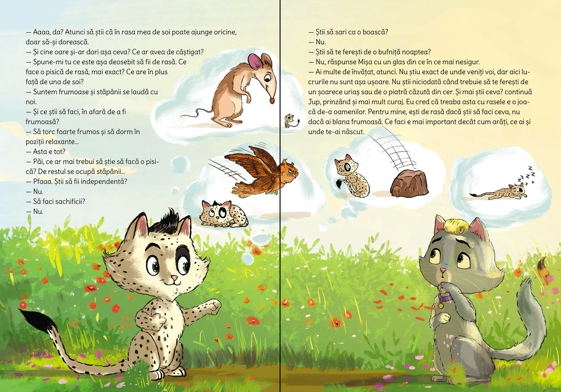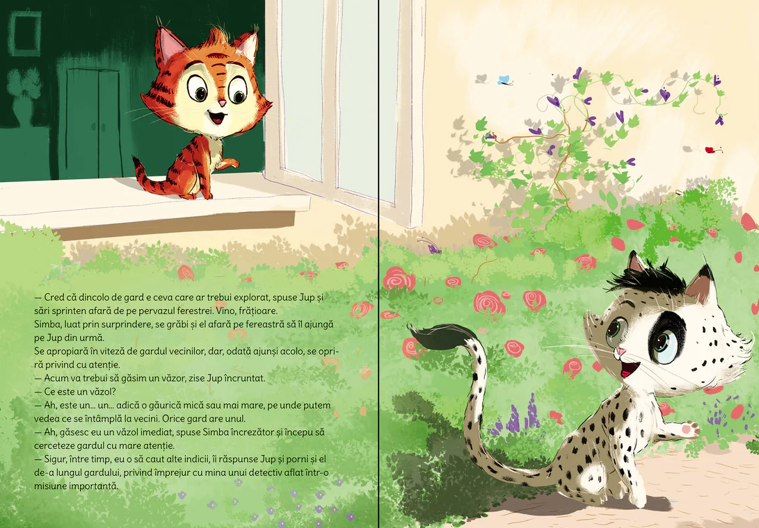 Seamănă extraordinar de bine cu Jup şi Simba, de fapt, dar au ceva în plus: maniere! Şi ceva în minus: experienţă în traiul la ţară. Din fericire, cei patru se împrietenesc repede şi decid să se ajute între ei, ca nişte vecini cumsecade. Şi iată cum Jup învaţă cele cinci reguli ale pisicilor de rasă – în câteva minute le-a şi memorat. Cât despre regulile pisoilor de soi, hehe, Mişa va trebui să se străduiască mai mult, că nu sunt uşoare!