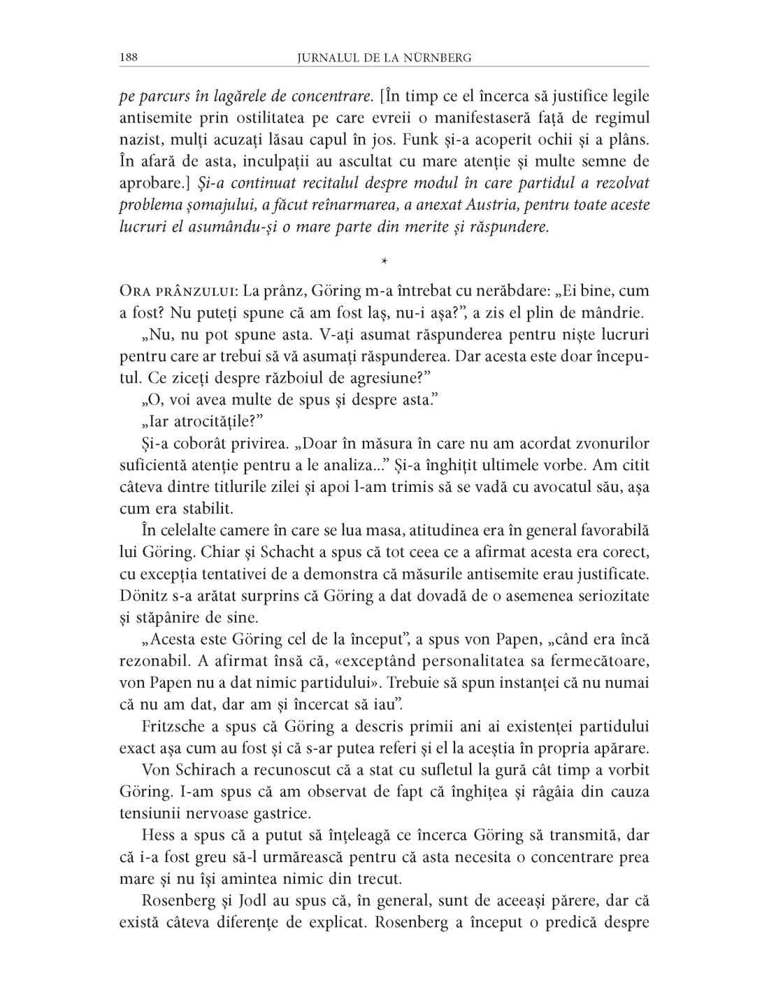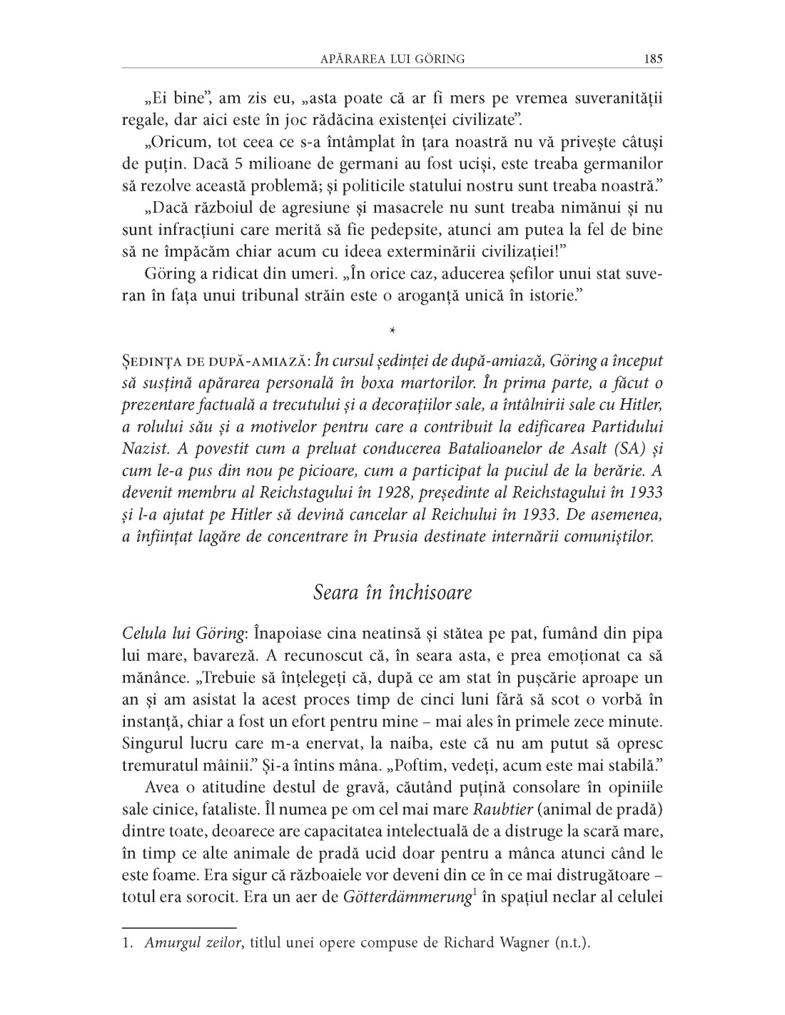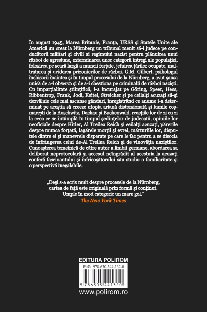 În august 1945, Marea Britanie, Franţa, URSS şi Statele Unite ale Americii au creat la Nürnberg un tribunal menit să-i judece pe conducătorii militari şi civili ai regimului nazist pentru plănuirea unui război de agresiune, exterminarea unor categorii întregi ale populaţiei, folosirea pe scară largă a muncii forţate, jefuirea ţărilor ocupate, maltratarea şi uciderea prizonierilor de război. G.M. Gilbert, psihologul închisorii înaintea şi în timpul procesului de la Nürnberg, a avut şansa unică de a-i observa şi de a-i chestiona pe criminalii de război nazişti. Cu imparţialitate ştiinţifică, i-a încurajat pe Göring, Speer, Hess, Ribbentrop, Frank, Jodl, Keitel, Streicher şi pe ceilalţi acuzaţi să-şi dezvăluie cele mai ascunse gânduri, înregistrând ce anume i-a determinat pe aceştia să creeze utopia ariană distorsionată şi lumile coşmareşti de la Auschwitz, Dachau şi Buchenwald, reacţiile lor de zi cu zi la ceea ce se întâmplă în timpul şedinţelor de judecată, opiniile lor neoficiale despre Hitler, Al Treilea Reich şi ceilalţi acuzaţi, părerile despre munca forţată, lagărele morţii şi evrei, mărturiile lor, disputele dintre ei şi manevrele disperate pe care le fac pentru a se disocia de înfrângerea celui de-Al Treilea Reich şi de vinovăţia naziştilor. Cunoaşterea temeinică de către autor a limbii germane, abordarea sa deliberat neprotocolară şi accesul neîngrădit al acestuia la acuzaţi conferă fascinantului şi înfricoşătorului său studiu o familiaritate şi o perspectivă inegalabile.