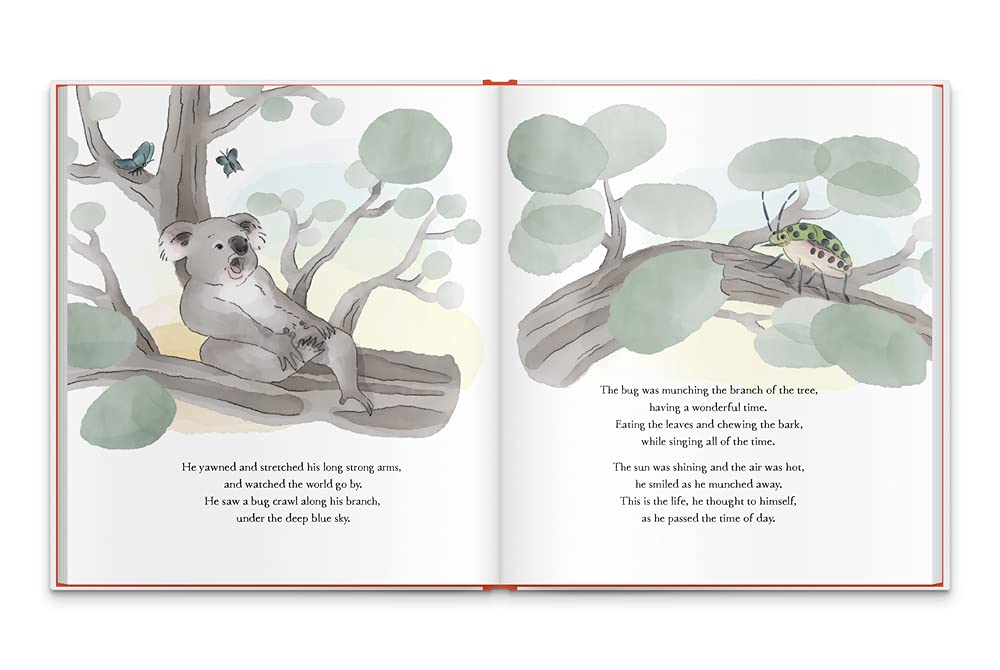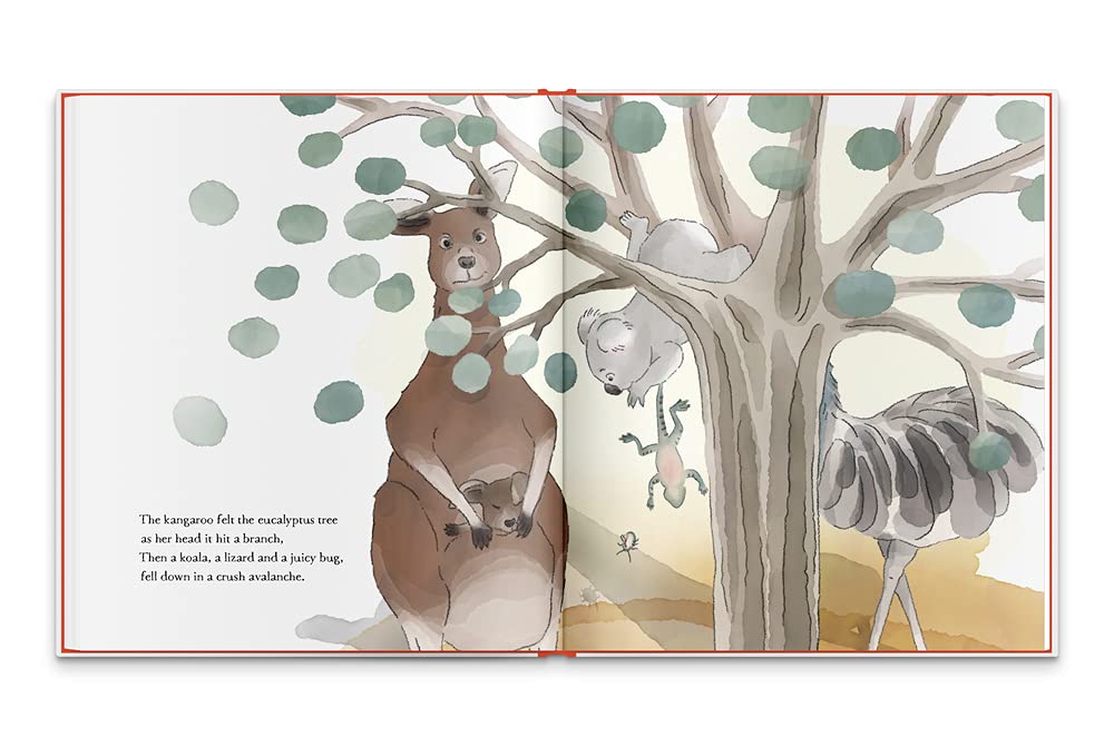 They are all in search of some shade and food on a very hot day. The Koala, enjoying his eucalyptus leaves, watches as events happen around him. Then a bug, a water dragon lizard, an Emu and a mother Kangaroo with her Joey, all enter the story. See what eventually happens and causes an hilarious crush between them in this sunny desert savannah.