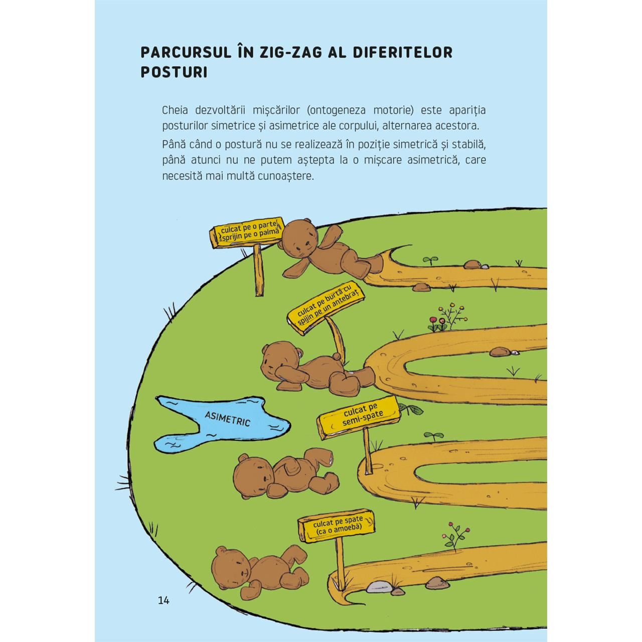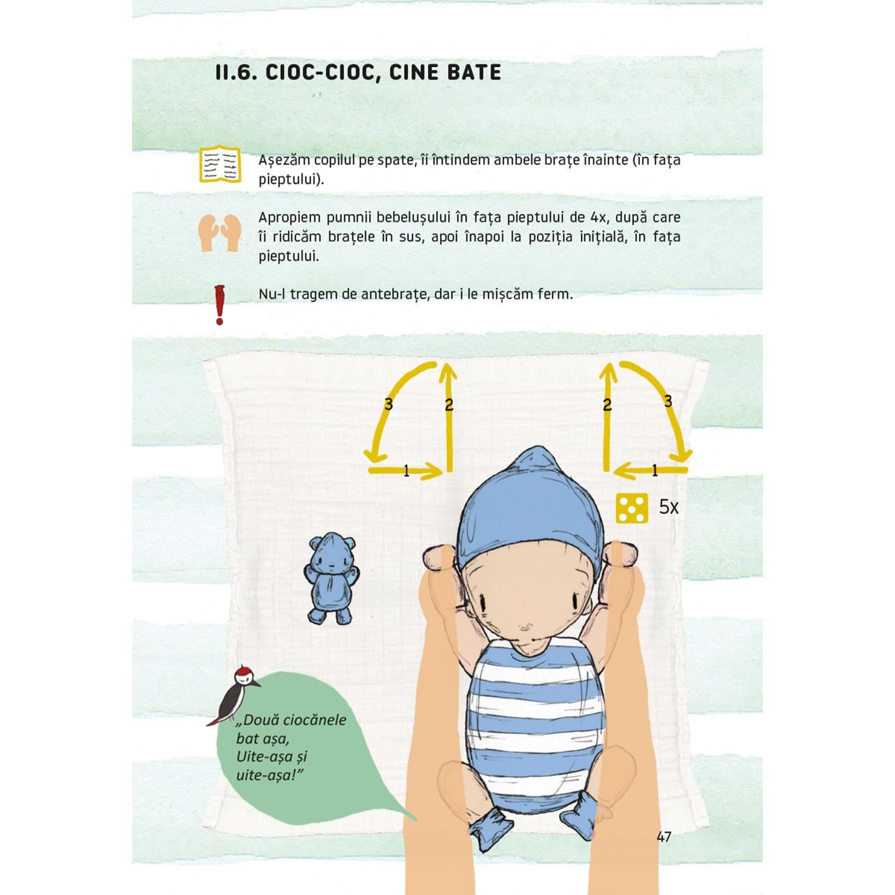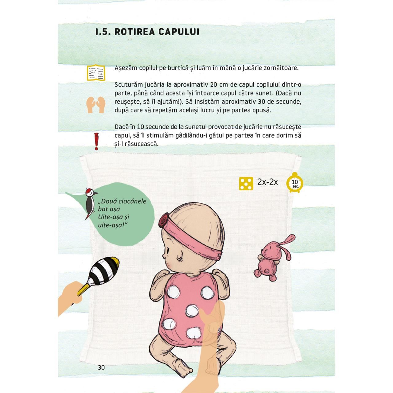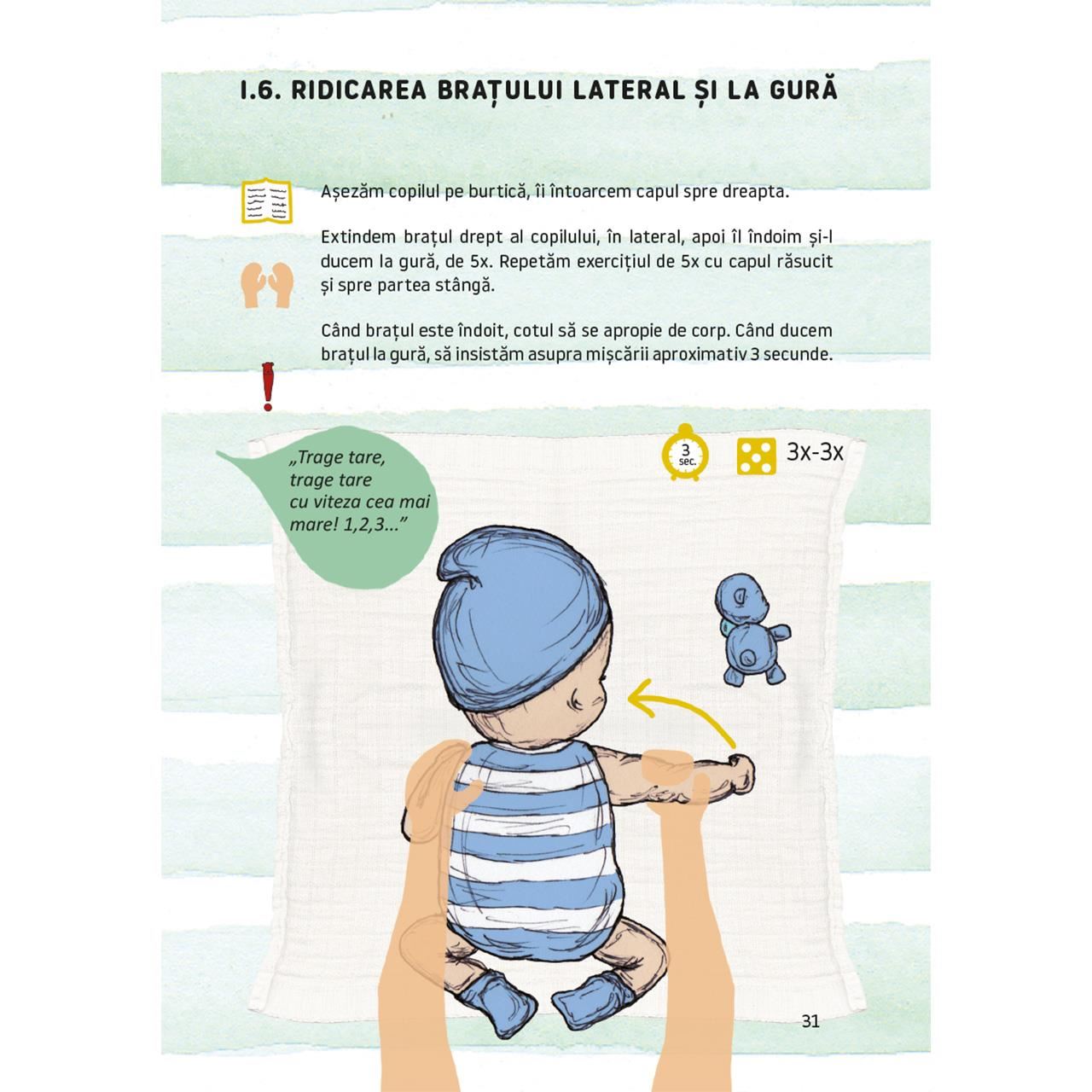 În această carte, am adunat 60 de exerciții de dezvoltare a motricității bebelușilor până la 9 luni, selectate din repertoriul fizioterapeuților cu care am lucrat; ele pot fi executate și acasă, fără echipament special de gimnastică, pentru a consolida calitatea mișcărilor de ridicare a capului, de sprijin pe antebrațe, de rostogolire și de târâre.