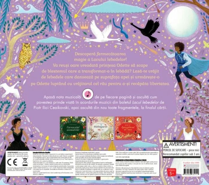 Apasă nota muzicală de pe fiecare pagină și ascultă cum povestea prinde viață în acordurile muzicii din baletul Lacul lebedelor de Piotr Ilici Ceaikovski, apoi ascultă din nou toate fragmentele, la finalul cărții.