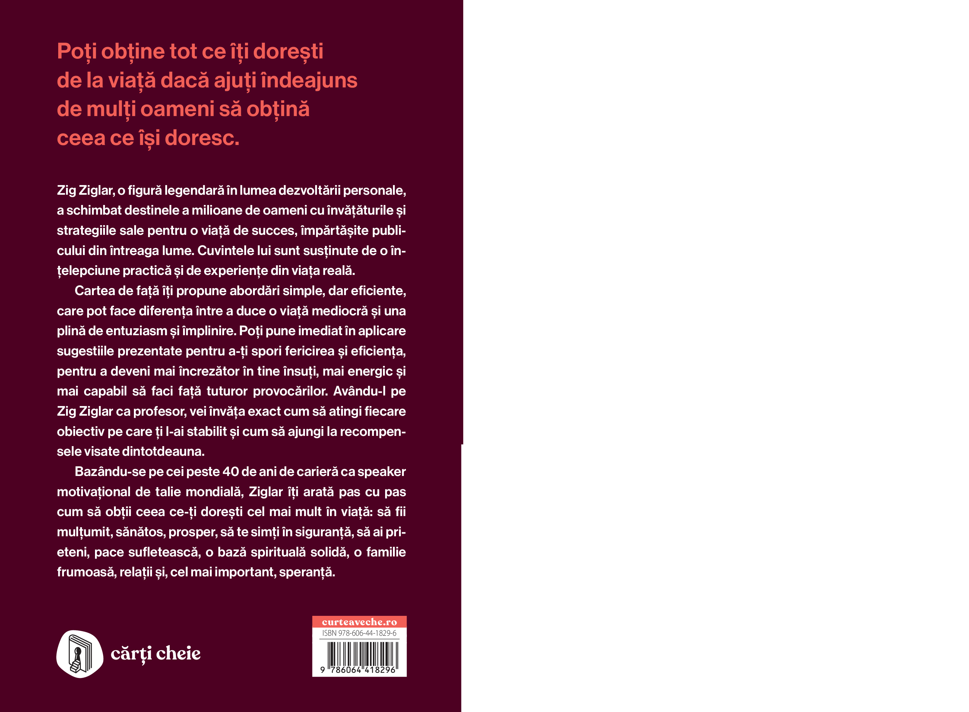Bazându-se pe cei peste 40 de ani de carieră ca speaker motivațional de talie mondială, Ziglar îți arată pas cu pas cum să obții ceea ce-ți dorești cel mai mult în viață: să fii mulțumit, sănătos, prosper, să te simți în siguranță, să ai prieteni, pace sufletească, o bază spirituală solidă, o familie frumoasă, relații și, cel mai important, speranță.