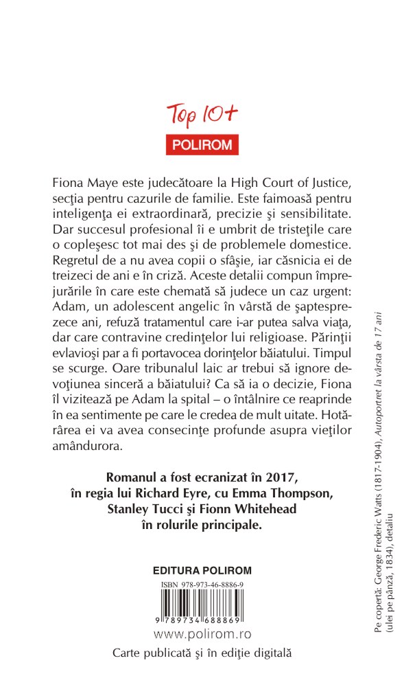 Fiona Maye este judecătoare la High Court of Justice, secţia pentru cazurile de familie. Este faimoasă pentru inteligenţa ei extraordinară, precizie şi sensibilitate. Dar succesul profesional îi e umbrit de tristeţile care o copleşesc tot mai des şi de problemele domestice. Regretul de a nu avea copii o sfâşie, iar căsnicia ei de treizeci de ani e în criză. Aceste detalii compun împrejurările în care este chemată să judece un caz urgent: Adam, un adolescent angelic în vârstă de şaptesprezece ani, refuză tratamentul care i-ar putea salva viaţa, dar care contravine credinţelor lui religioase. Părinţii evlavioşi par a fi portavocea dorinţelor băiatului. Timpul se scurge. Oare tribunalul laic ar trebui să ignore devoţiunea sinceră a băiatului? Ca să ia o decizie, Fiona îl vizitează pe Adam la spital – o întâlnire ce reaprinde în ea sentimente pe care le credea de mult uitate. Hotărârea ei va avea consecinţe profunde asupra vieţilor amândurora.
