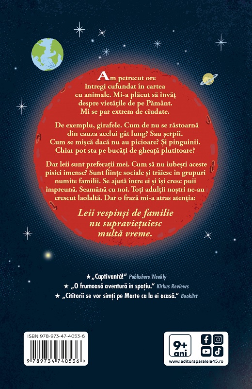 Am petrecut ore întregi cufundat în cartea cu animale. Mi-a plăcut să învăț despre vietățile de pe Pământ. Mi se par extrem de ciudate. De exemplu, girafele. Cum de nu se răstoarnă din cauza acelui gât lung? Sau șerpii. Cum se mișcă dacă nu au picioare? Și pinguinii. Chiar pot sta pe bucăți de gheață plutitoare? Dar leii sunt preferații mei. Cum să nu iubești aceste pisici imense? Sunt ființe sociale și trăiesc în grupuri numite familii. Se ajută între ei și își cresc puii împreună. Seamănă cu noi. Toți adulții noștri ne-au crescut laolaltă. Dar o frază mi-a atras atenția: Leii respinși de familie nu supraviețuiesc multă vreme.