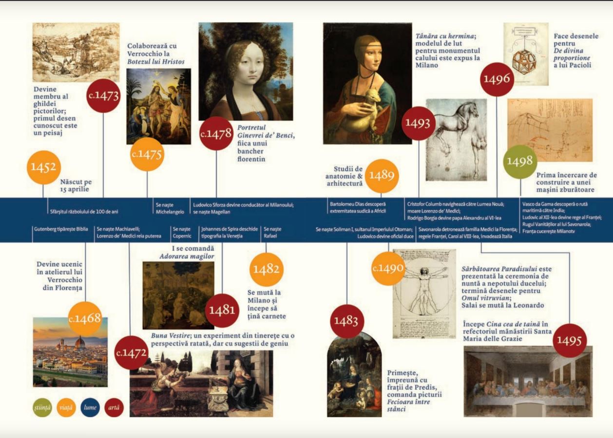 Creativitatea sa, asemănătoare cu cea a altor mari inovatori, provenea din poziționarea la intersecția științelor umaniste cu tehnologia. Leonardo a jupuit carnea de pe fețele cadavrelor, a desenat mușchii care mișcă buzele și apoi a pictat cel mai memorabil zâmbet din istorie în Mona Lisa. A explorat matematica opticii, a demonstrat felul în care razele de lumină lovesc corneea și a creat iluzii prin schimbarea perspectivelor în Cina cea de Taină. Isaacson descrie, de asemenea, dragostea de o viață a lui Leonardo pentru punerea în scenă a unor producții teatrale, susținute de picturile și invențiile sale.