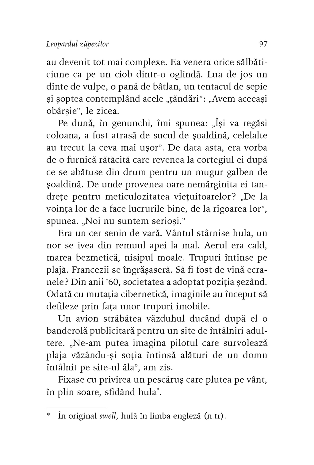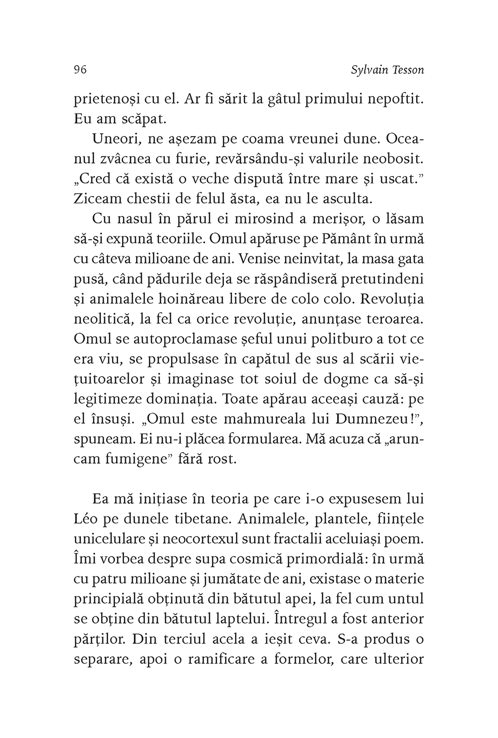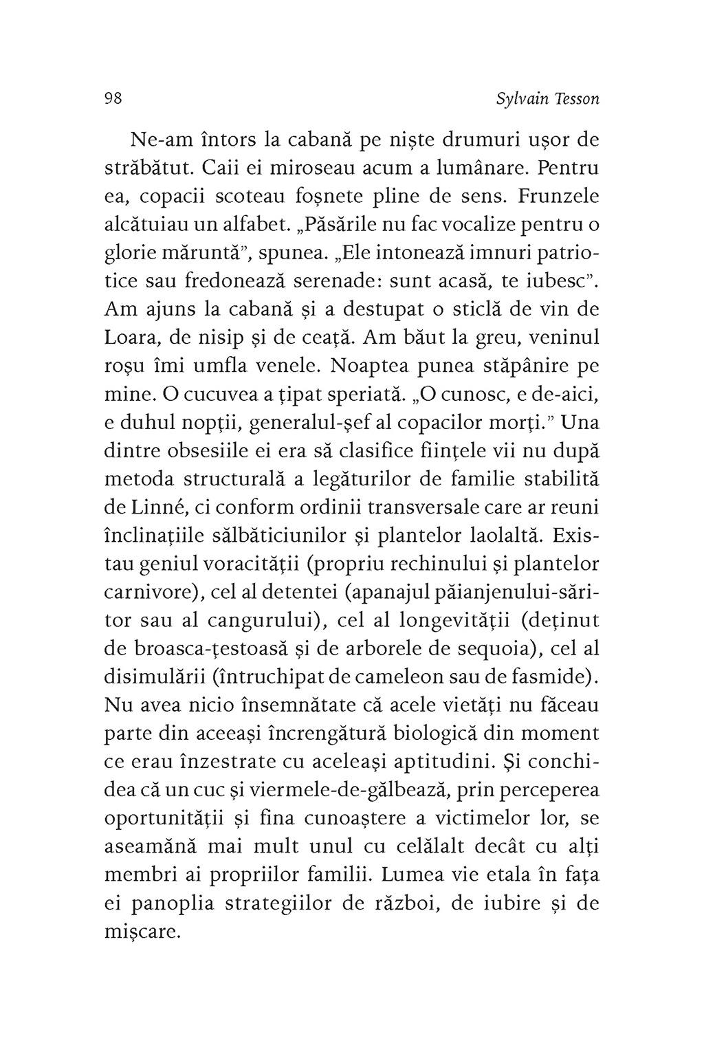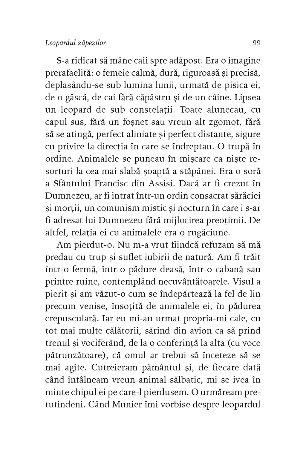 În 2018, la invitația fotografului Vincent Munier, Sylvain Tesson pleacă în Tibet, în căutarea leopardului zăpezilor. Amenințat cu dispariția, acest animal trăiește la altitudini mari, în zone aproape inaccesibile. Astăzi mai sînt aproximativ 5.000 de exemplare, răspîndite din Pamir pînă în estul Himalayei, din Altai pînă în Nepal. Pe platoul Changtang, Sylvain Tesson privește turmele de iaci, capre albastre și antilope ce străbat întinderile înierbate, întîlnește cîte un lup singuratic aflat în căutarea prăzii, iar în cele din urmă ajunge în regatul leopardului zăpezilor. După lungi zile de așteptare într-un ger cumplit, leopardul își va face apariția, aducîndu-i în minte chipul celor două femei pe care le-a iubit, dar și trista imagine a unei lumi viitoare în care, din cauza acțiunilor omului, animalele vor fi din ce în ce mai puține.