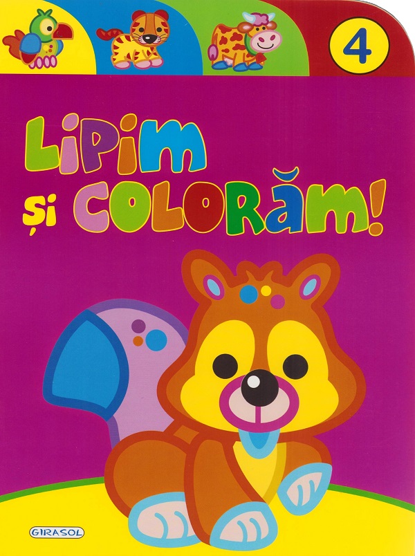 Carte de colorat cu autocolante pentru fiecare desen in parte, sugereaza astfel culoriile ce pot fi folosite.