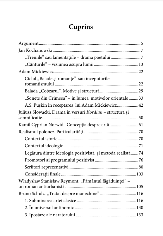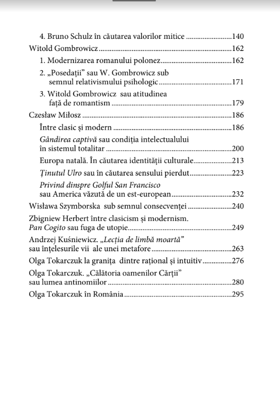 'Volumul de față cuprinde studii și articole consacrate celor mai importanți poeți și prozatori polonezi de-a lungul timpului, de la Renaștere până la perioada modernă și postmodernă. Succesiunea cronologică a reflecțiilor critice permite înțelegerea specificului diferitelor perioade literare și pune în evidență totodată o anumită dinamică a procesului literar polonez.