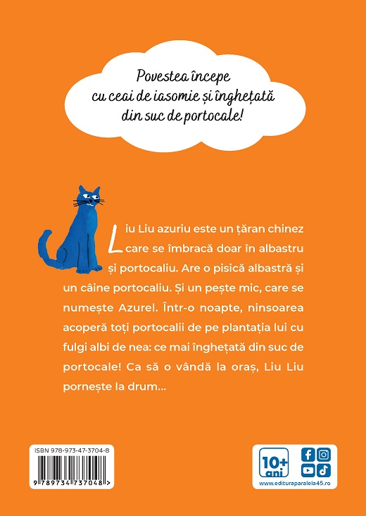 Și un pește mic, care se numește Azurel. Într-o noapte, ninsoarea acoperă toți portocalii de pe plantația lui cu fulgi albi de nea: ce mai înghețată din suc de portocale! Ca să o vândă la oraș, Liu Liu pornește la drum…