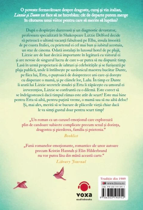 După o despărțire dureroasă și un diagnostic devastator, profesoara specializată în Shakespeare Lizzie Delford decide să petreacă o ultimă vacanță fabuloasă pe Elba, insula însorită de pe coasta Italiei, cu prietenul ei cel mai bun și iubitul acestuia, un star de cinema. Odată instalați în luxosul hotel de pe plajă, Lizzie are de luat decizii importante în legătură cu viitorul ei și are nevoie de singurul lucru de care s-ar putea să nu dispună: timp. Lasă în urmă proprietarii de iahturi și celebritățile și se furișează pe plaja publică, unde îi întâlnește pe sardonicul maestru bucătar Dante, pe fiica lui, Etta, o puștoaică de doisprezece ani care-și dorește cu disperare o mamă, și pe câinele lor, Lulu. În timp ce Dante îi arată lui Lizzie secretele insulei și Etta îi zăpăcește cu umorul ei ireverențios, Lizzie se confruntă cu o dilemă. Este corect să se îndrăgostească dacă timpul rămas este atât de scurt? Este mai bine pentru Etta să aibă, pentru puțină vreme, o mamă sau să nu aibă deloc? Și, mai ales, merită să se bucure de plăcerile vieții chiar dacă le va simți gustul doar pentru scurt timp?