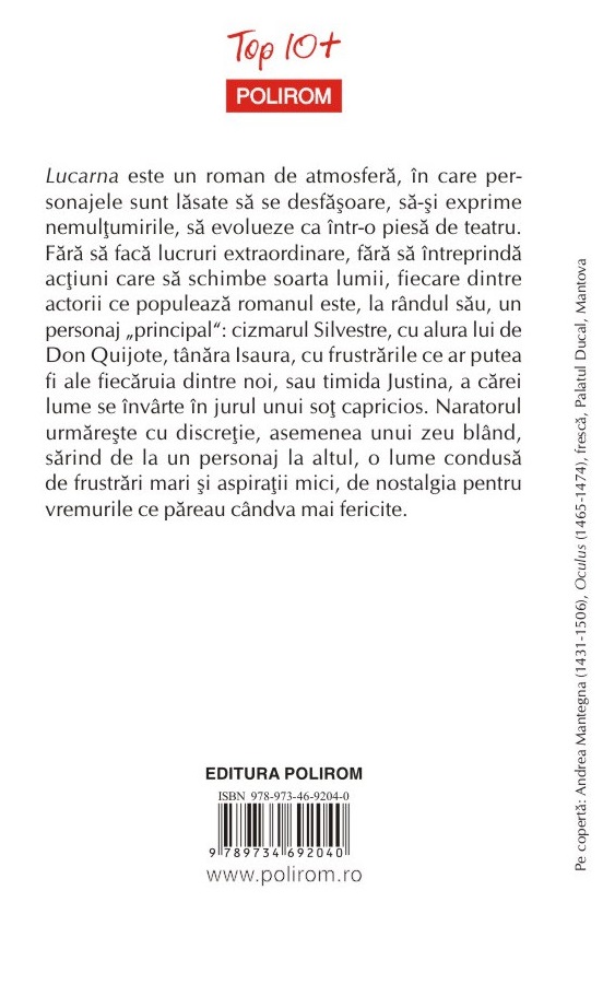 Lucarna este un roman de atmosferă, în care personajele sunt lăsate să se desfăşoare, să-şi exprime nemulţumirile, să evolueze ca într-o piesă de teatru. Fără să facă lucruri extraordinare, fără să întreprindă acţiuni care să schimbe soarta lumii, fiecare dintre actorii ce populează romanul este, la rândul său, un personaj „principal”: cizmarul Silvestre, cu alura lui de Don Quijote, tânăra Isaura, cu frustrările ce ar putea fi ale fiecăruia dintre noi, sau timida Justina, a cărei lume se învârte în jurul unui soţ capricios. Naratorul urmăreşte cu discreţie, asemenea unui zeu blând, sărind de la un personaj la altul, o lume condusă de frustrări mari şi aspiraţii mici, de nostalgia pentru vremurile ce păreau cândva mai fericite.