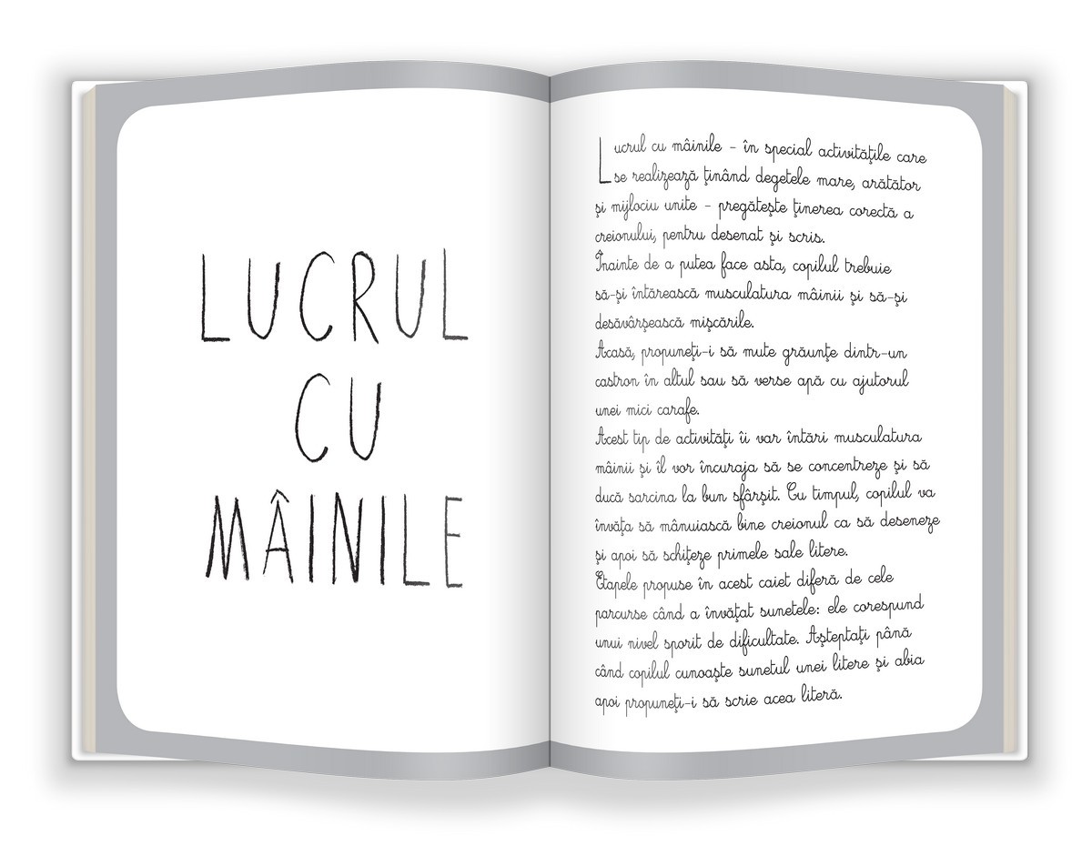 Cele patru caiete de lucru concepute de Marie Kirchner, directoarea unei şcoli Montessori din Paris, propun activităţi tactile şi vizuale ce încurajează copilul să lucreze singur şi să descopere, treptat, formele şi numerele, literele cursive şi sunetele, apoi scrierea. Sfaturile pentru părinţi, incluse la începutul fiecărui caiet, sunt utile pentru a înţelege cum trebuie încurajată şi favorizată dezvoltarea abilităţilor copilului.