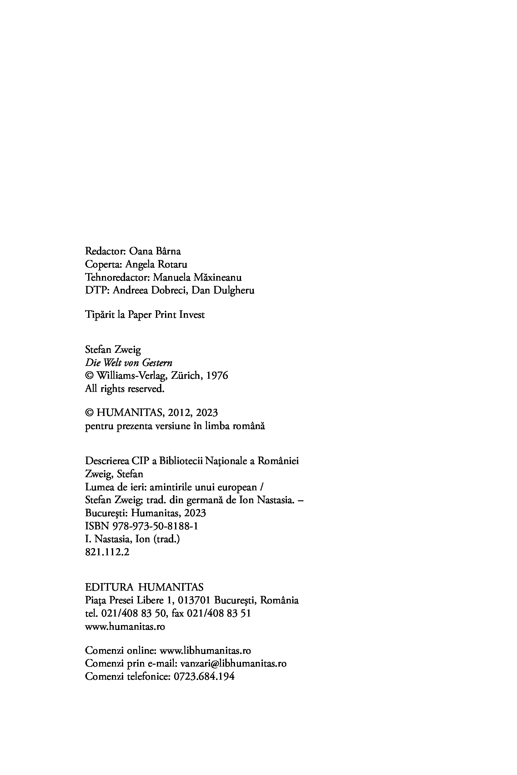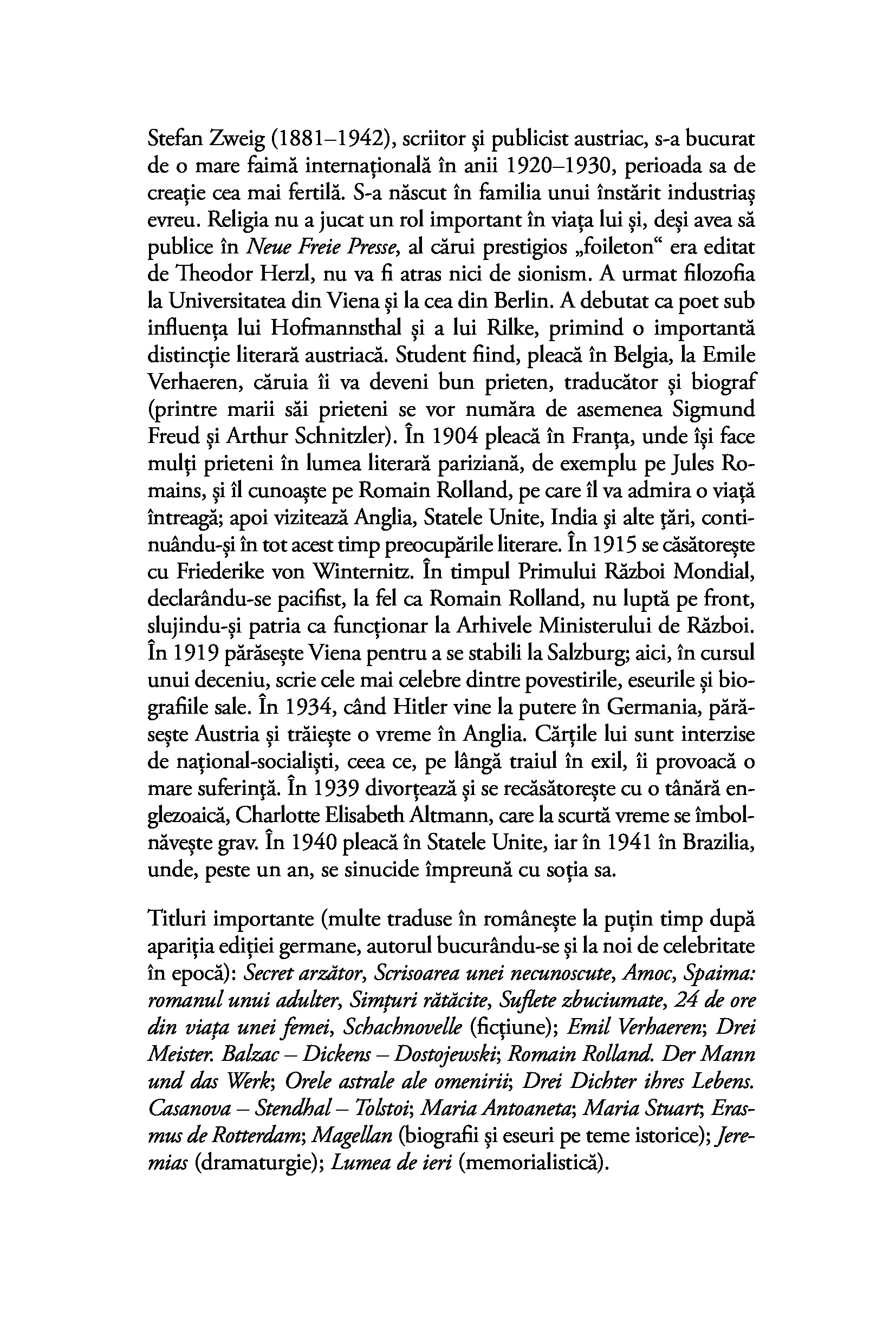 STEFAN ZWEIG s-a născut în 1881, la Viena, în familia unui înstărit industriaş evreu. Studiază filozofia la Universitatea din Viena, iar în 1904 obţine titlul de doctor cu o lucrare dedicată ideilor lui Hippolyte Taine. În 1904 pleacă în Franţa, unde îl cunoaşte pe Romain Rolland, pe care îl va admira o viaţă întreagă. Vizitează Anglia, Statele Unite, India şi alte ţări, continuându-şi în tot acest timp preocupările literare. În 1915 se căsătoreşte cu Friederike von Winternitz. În timpul Primului Război Mondial, declarându-se pacifist, nu luptă pe front, slujindu-şi patria ca funcţionar la Arhivele Ministerului de Război. În 1919 părăseşte Viena pentru a se stabili la Salzburg; aici, în cursul unui deceniu, scrie cele mai celebre dintre povestirile, eseurile şi biografiile sale, care i-au adus consacrarea şi notorietatea. În 1934, când Hitler vine la putere în Germania, părăseşte Austria şi trăieşte o vreme în Anglia. Cărţile lui sunt interzise de naţional-socialişti, ceea ce, pe lângă traiul în exil, îi provoacă o mare suferinţă. În 1939 divorţează şi se recăsătoreşte cu o tânără englezoaică, Charlotte Elisabeth Altmann. În 1940, în faţa expansiunii naziste în Europa, familia Zweig se refugiază peste Ocean, rămânând pentru scurt timp la New York, apoi, în acelaşi an, se stabileşte la Petropolis, în Brazilia. Pe 22 februarie 1942, Stefan Zweig şi soţia sa, Lotte, se sinucid. Impresionanta opera a lui Zweig cuprinde lucrări de ficţiune – Scrisoarea unei necunoscute, Amoc, Spaima: romanul unui adulter, Simţuri rătăcite, Suflete zbuciumate, Douăzeci şi patru de ore din viaţa unei femei –, biografii şi eseuri pe teme istorice – Orele astrale ale omenirii, Maria Antoaneta, Maria Stuart, Erasmus de Rotterdam, Magellan – şi memorialistică – Lumea de ieri (Humanitas, 2012).