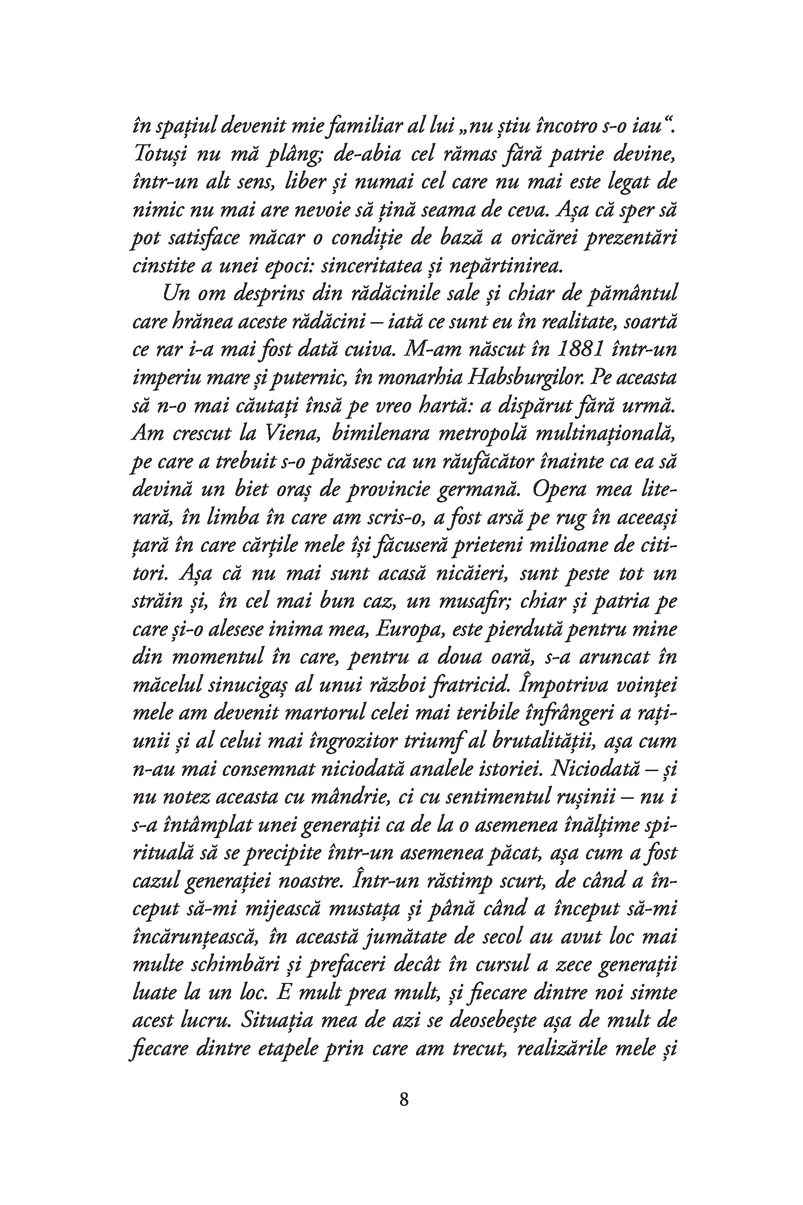 Odată cu catastrofa din 1914, lumea aceasta dispare treptat: tronurile se prăbușesc, ideile se tulbură, o întreagă civilizație începe să se scufunde, pentru ca, odată cu venirea lui Hitler la putere, să fie înghițită de barbaria nazistă.