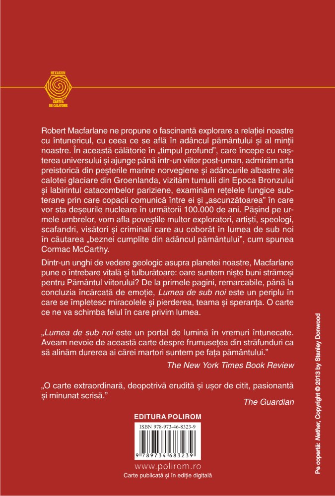 Dintr-un unghi de vedere geologic asupra planetei noastre, Macfarlane pune o întrebare vitală și tulburătoare: oare sîntem niște buni strămoși pentru Pămîntul viitorului? De la primele pagini, remarcabile, pînă la concluzia încărcată de emoție, Lumea de sub noi este un periplu în care se împletesc miracolele și pierderea, teama și speranța. O carte ce ne va schimba felul în care privim lumea.