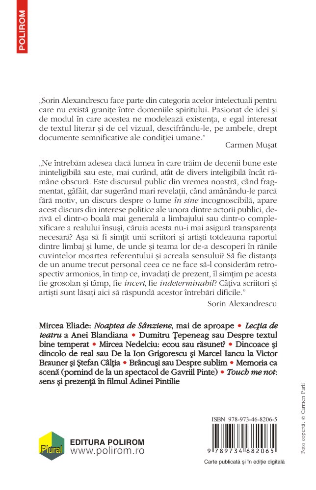 „Ne întrebăm adesea dacă lumea în care trăim de decenii bune este ininteligibilă sau este, mai curînd, atît de divers inteligibilă încît rămîne obscură. Este discursul public din vremea noastră, cînd fragmentat, gîfîit, dar sugerînd mari revelații, cînd amînîndu-le parcă fără motiv, un discurs despre o lume în sine incognoscibilă, apare acest discurs din interese politice ale unora dintre actorii publici, derivă el dintr-o boală mai generală a limbajului sau dintr-o complexificare a realului însuși, căruia acesta nu-i mai asigură transparența necesară? Așa să fi simțit unii scriitori și artiști totdeauna raportul dintre limbaj și lume, de unde și teama lor de-a descoperi în rănile cuvintelor moartea referentului și acreala sensului? Să fie distanța de un anume trecut personal ceea ce ne face să-l considerăm retrospectiv armonios, în timp ce, invadați de prezent, îl simțim pe acesta fie grosolan și tîmp, fie incert, fie indeterminabil? Cîțiva scriitori și artiști sînt lăsați aici să răspundă acestor întrebări dificile.” (Sorin Alexandrescu)