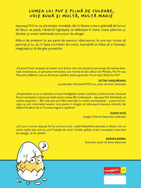 „Poziționându-se ca un adevărat urmaş al îndrăgitelor artiste Livia Rusz şi Felicia Avram, Emanuel Pavel inventează un personaj inedit pentru lumea BD românească - iepuraşul Puf. Adresându-se copiilor preşcolari - BD-urile sale sunt fără texte (dar cu multe onomatopee), autorul işi dorește ca, prin intermediul acestor mici poeme în imagini, să stârnească interesul cititorilor săi, călătorind alături de ei în lumea magică a copilăriei."