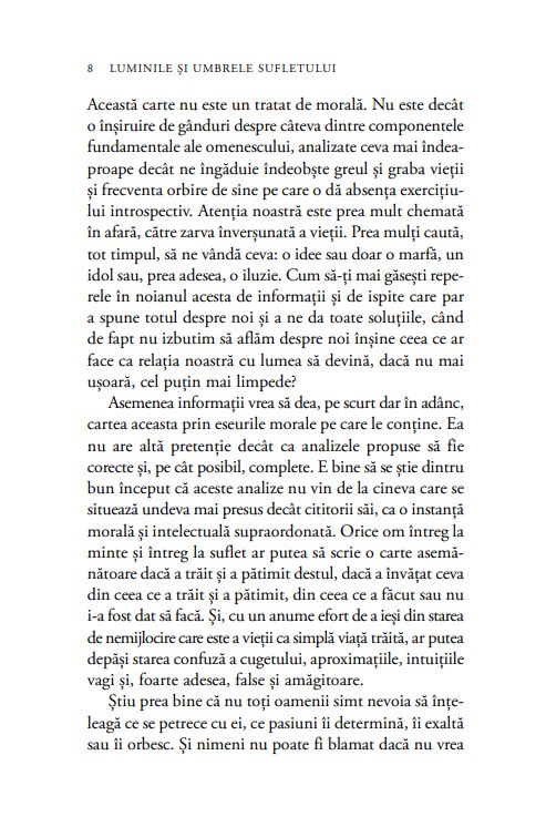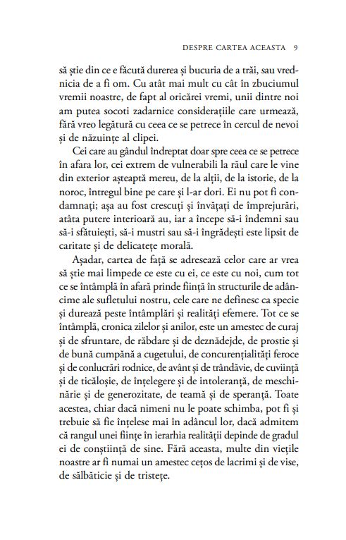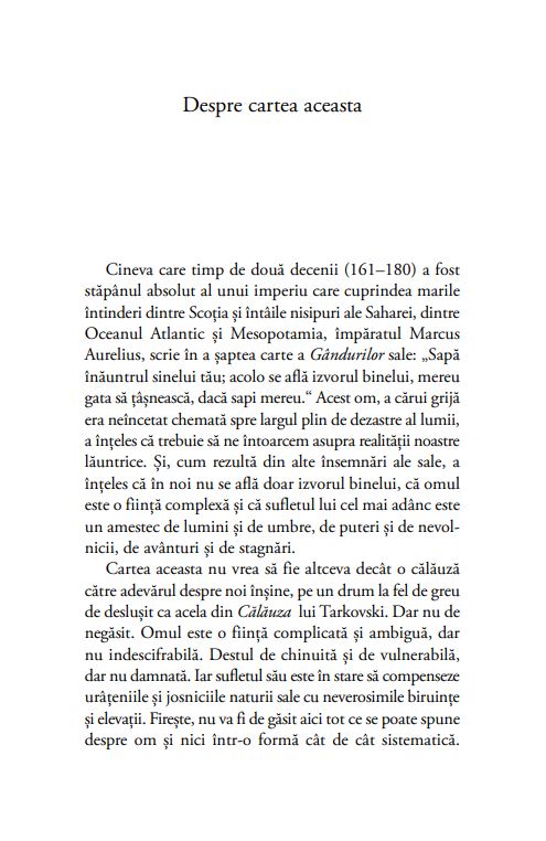 Cartea aceasta nu vrea să fie altceva decât o călăuză către adevărul despre noi înşine, pe un drum la fel de greu de desluşit ca acela din Călăuza lui Tarkovski. Dar nu de negăsit. Omul este o fiinţă complicată şi ambiguă, dar nu indescifrabilă. Destul de chinuită şi de vulnerabilă, dar nu damnată. Iar sufletul său este în stare să compenseze urâţeniile şi josniciile naturii sale cu neverosimile biruinţe şi elevaţii...Atenţia noastră este prea mult chemată în afară, către zarva înverşunată a vieţii. Prea mulţi caută, tot timpul, să ne vândă ceva: o idee sau doar o marfă, un idol sau, prea adesea, o iluzie. Cum să-ţi mai găseşti reperele în noianul acesta de informaţii şi de ispite care par a spune totul despre noi şi a ne da toate soluţiile, când de fapt nu izbutim să aflăm despre noi înşine ceea ce ar face ca relaţia noastră cu lumea să devină, dacă nu mai uşoară, cel puţin mai limpede?Asemenea informaţii vrea să dea, pe scurt, dar în adânc, cartea aceasta prin eseurile morale pe care le conţine. (Petru CREŢIA)