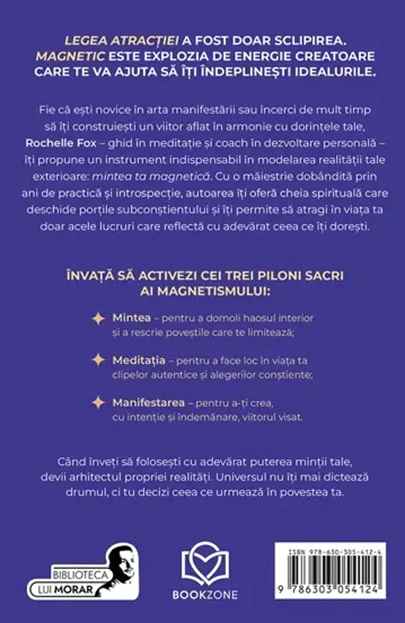 Fie că ești novice în arta manifestării sau încerci de mult timp să îți construiești un viitor aflat în armonie cu dorințele tale, Rochelle Fox – ghid în meditație și coach în dezvoltare personală – îți propune un instrument indispensabil în modelarea realității tale exterioare: mintea ta magnetică. Cu o măiestrie dobândită prin ani de practică și introspecție, autoarea îți oferă cheia spirituală care deschide porțile subconștientului și îți permite să atragi în viața ta doar acele lucruri care reflectă cu adevărat ceea ce îți dorești. Când înveți să folosești cu adevărat puterea minții tale, devii arhitectul propriei realități. Universul nu îți mai dictează drumul, ci tu decizi ceea ce urmează în povestea ta.