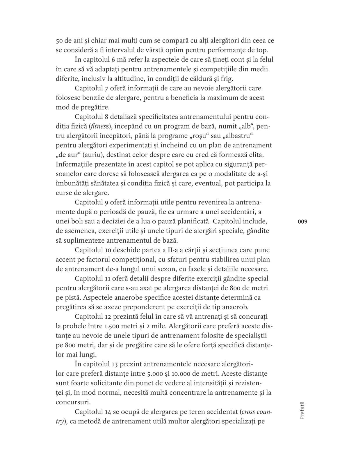 Cartea conține sfaturi de specialitate pentru efectuarea antrenamentelor specifice diferitelor probe, de la alergări de 800 de metri până la ultra-maraton sau triatlon. Veți afla cum puteți să vă întocmiți propriul plan de pregătire sau să urmați unul dintre cele 31 de programe de antrenament și exercițiile aferente elaborate de către Daniels. Volumul conține patru planuri - valabile de la nivelul începător până la cel de elită -, care vă vor ajuta să vă recăpătați condiția fizică după o accidentare.