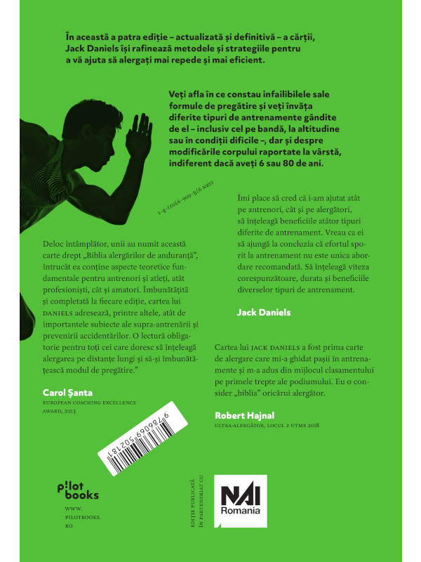 În această a patra ediție - actualizată și definitivă - a cărții, Jack Daniels își rafinează metodele și strategiile pentru a vă ajuta să alergați mai repede și mai eficient. Veți afla în ce constau infailibilele sale formule de pregătire și veți învăța diferitele tipuri de antrenamente gândite de el – inclusiv cel pe bandă, la altitudine sau în condiții dificile – dar și despre modificările corpului raportate la vârstă, indiferent dacă aveți 6 sau 80 de ani.