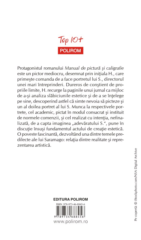 Protagonistul romanului Manual de pictură şi caligrafie este un pictor mediocru, desemnat prin iniţiala H., care primeşte comanda de a face portretul lui S., directorul unei mari întreprinderi. Dureros de conştient de propriile limite, H. recurge la paginile unui jurnal ca mijloc de a-şi analiza slăbiciunile estetice şi de a se înţelege pe sine, descoperind astfel că simte nevoia să picteze şi un al doilea portret al lui S. Munca la respectivele portrete, cel academic, pictat în modul consacrat şi instituit de normele comenzii, şi cel realizat cu intenţia, nefinalizată, de a capta imaginea „adevăratului S.”, pune în discuţie însuşi fundamentul actului de creaţie estetică. O poveste fascinantă, dezvoltând una dintre temele predilecte ale lui Saramago: relaţia dintre realitate şi reprezentarea artistică.