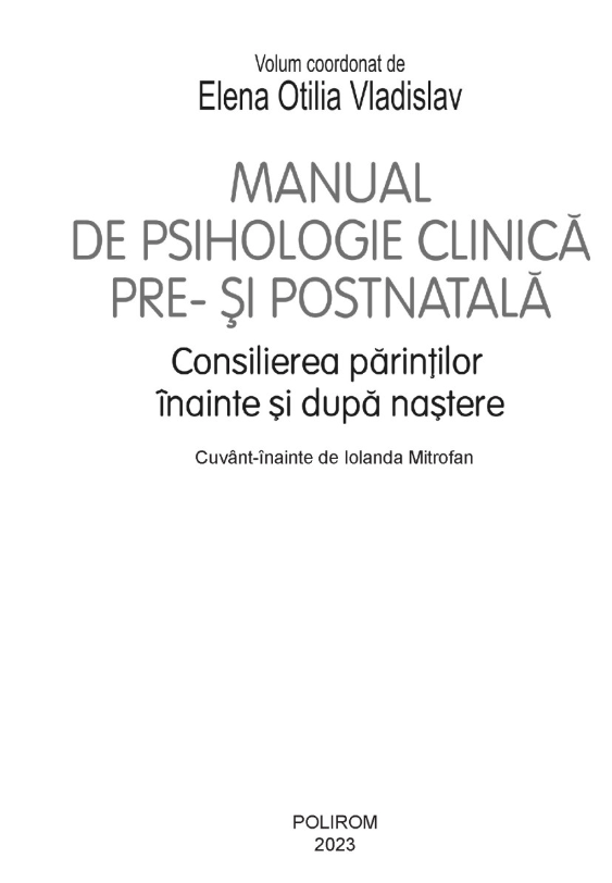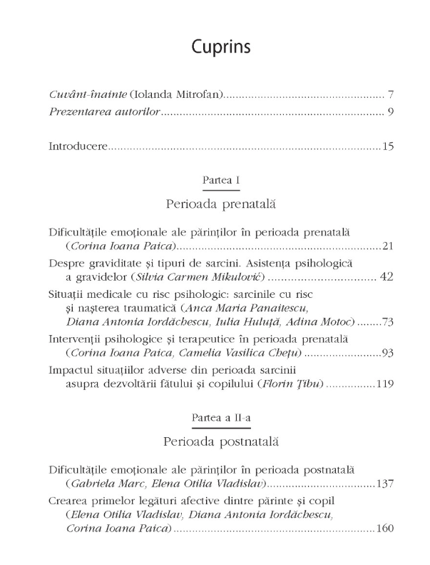 Dedicat psihologiei clinice și asistării terapeutice complexe și etapizate a pre- și postnatalității, volumul, ce reunește contribuțiile a numeroși specialiști din acest domeniu interdisciplinar, acoperă o largă paletă de teme din perioada prenatală (dificultăți emoționale ale gravidelor, pregătirea pentru naștere, dinamica în cuplu, dezvoltarea atașamentului antenatal) și din perioada postnatală (parentalitate, dificultățile emoționale post-partum, atașamentul postnatal, tulburările psihosomatice precoce ale bebelușului), tratând și o serie de situații medicale și psihologice speciale, de la infertilitate la pierderile de sarcină. Cuprinzând referiri la cercetări recente și prezentări ale unor situații clinice, volumul poate fi folosit atât ca manual teoretic, cât și ca ghid pentru asistarea psihologică ce poate fi acordată în perioada pre‑ și postnatală.