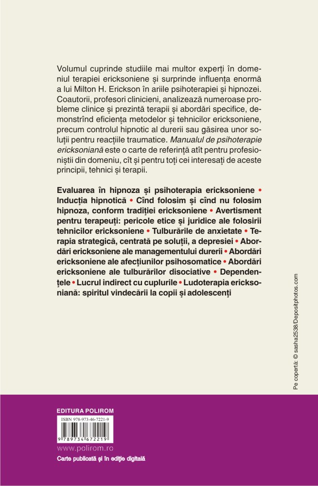 Volumul cuprinde studiile mai multor experţi în domeniul terapiei ericksoniene şi surprinde influenţa enormă a lui Milton H. Erickson în ariile psihoterapiei şi hipnozei. Coautorii, profesori clinicieni, analizează numeroase probleme clinice şi prezintă terapii şi abordări specifice, demonstrînd eficienţa metodelor şi tehnicilor ericksoniene, precum controlul hipnotic al durerii sau găsirea unor soluţii pentru reacţiile traumatice. Manual de psihoterapie ericksoniană este o carte de referinţă atît pentru profesioniştii din domeniu, cît şi pentru toţi cei interesaţi de aceste principii, tehnici şi terapii.